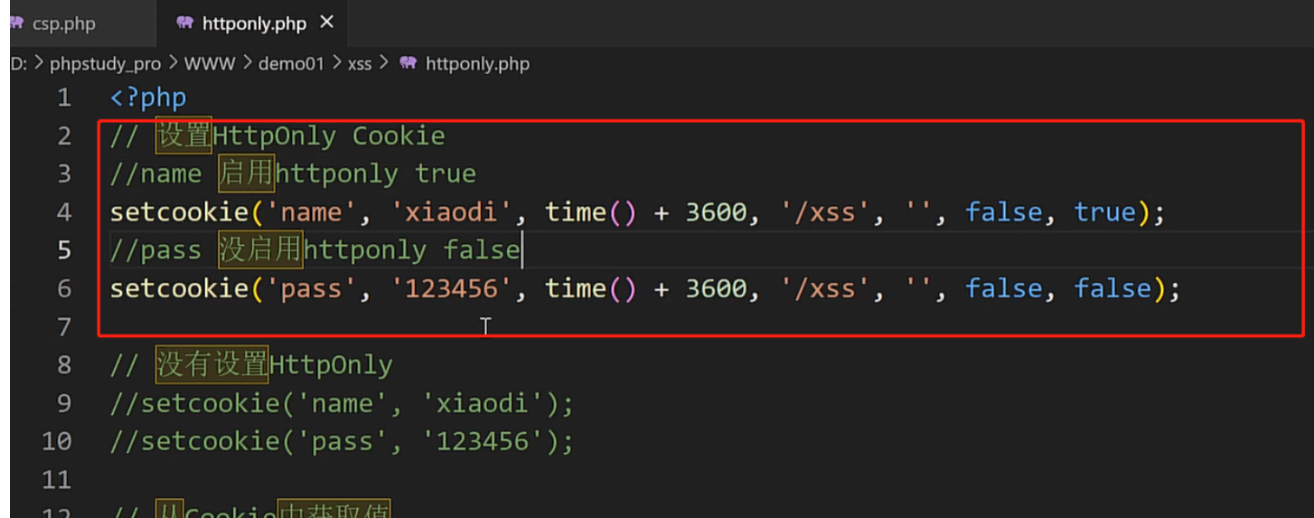 -setcookie('', '', time() + 3600, '/xss', '', false, true);