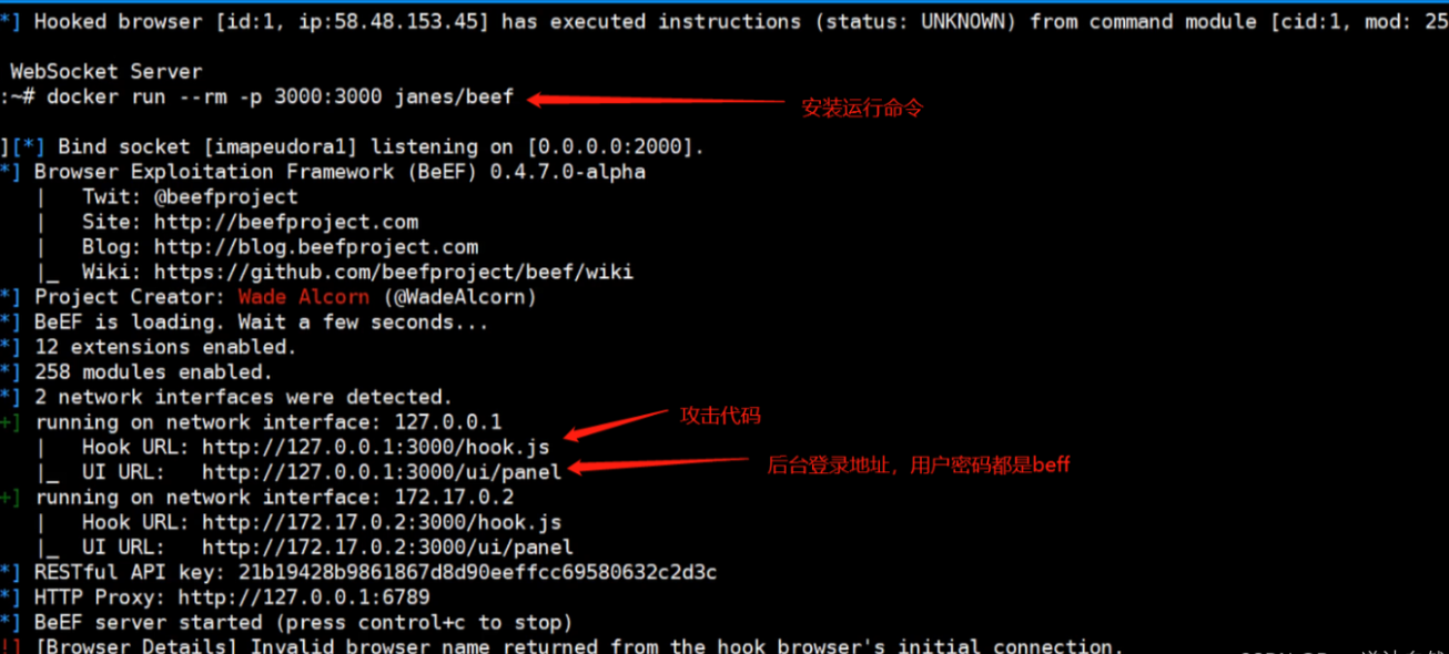 搭建:docker run --rm -p 3000:3000 janes/beef //安装命令