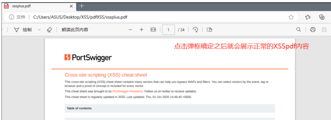 使用python3运行这个python文件即可在当前目录下生成一个XSS.pdf文件,用浏览器打开这个pdf即可触发js代码