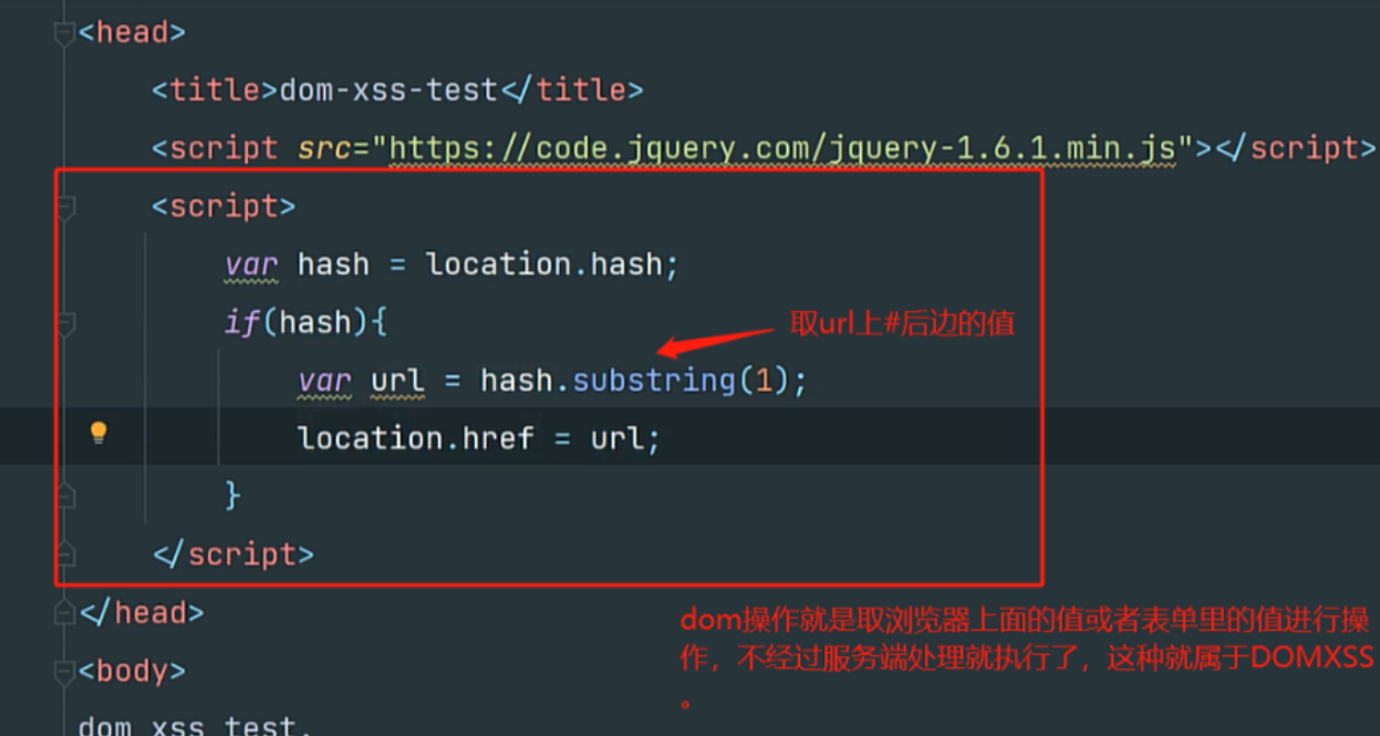 Dom型:DOM漏洞存在JS代码(由JS代码直接处理,不需要经过服务端处理),其他类型漏洞存在脚本代码(反射,存储,都需要经过服务端处理)