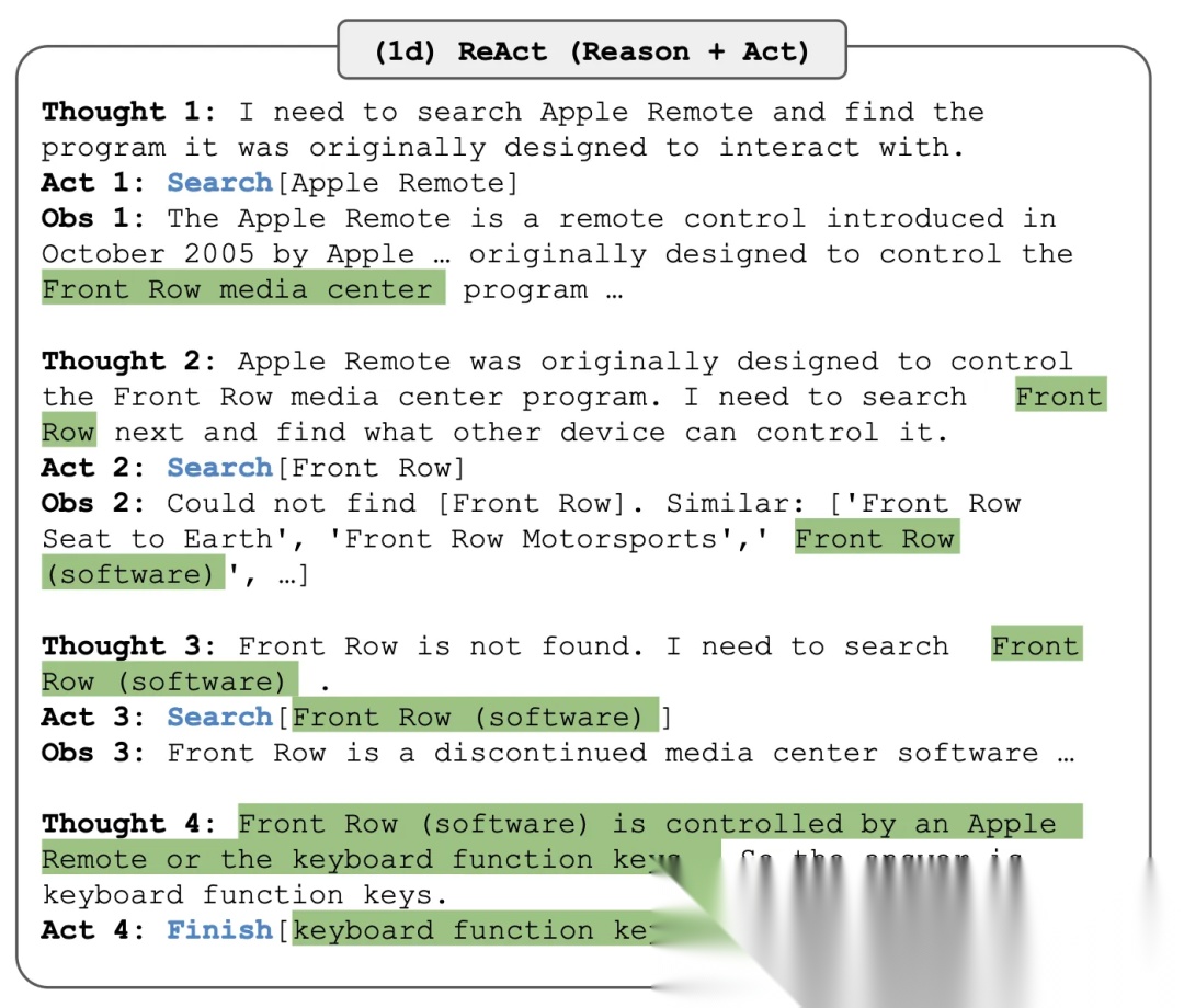 - Act(行动):模型与外部交互的“实际操作”,比如调用搜索引擎查信息、用计算器算数据、调用API订机票;