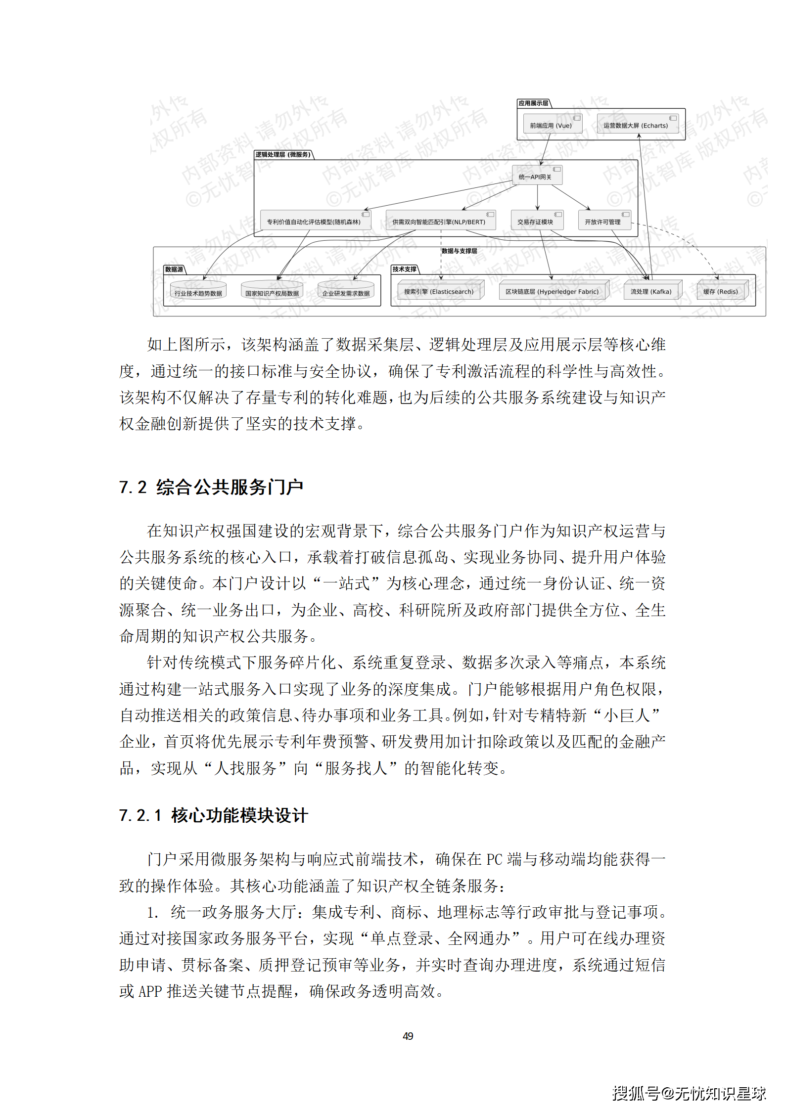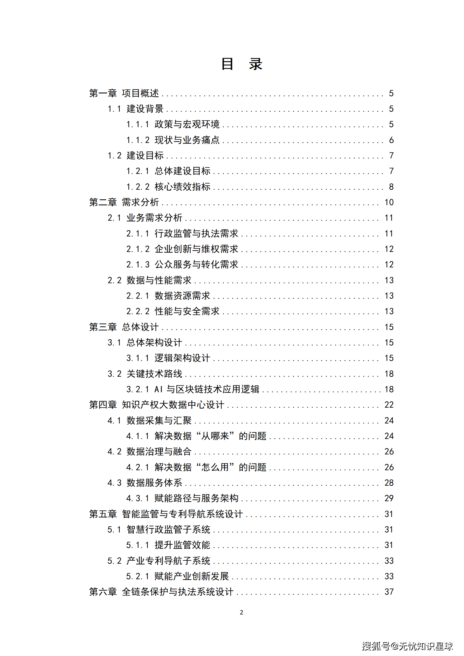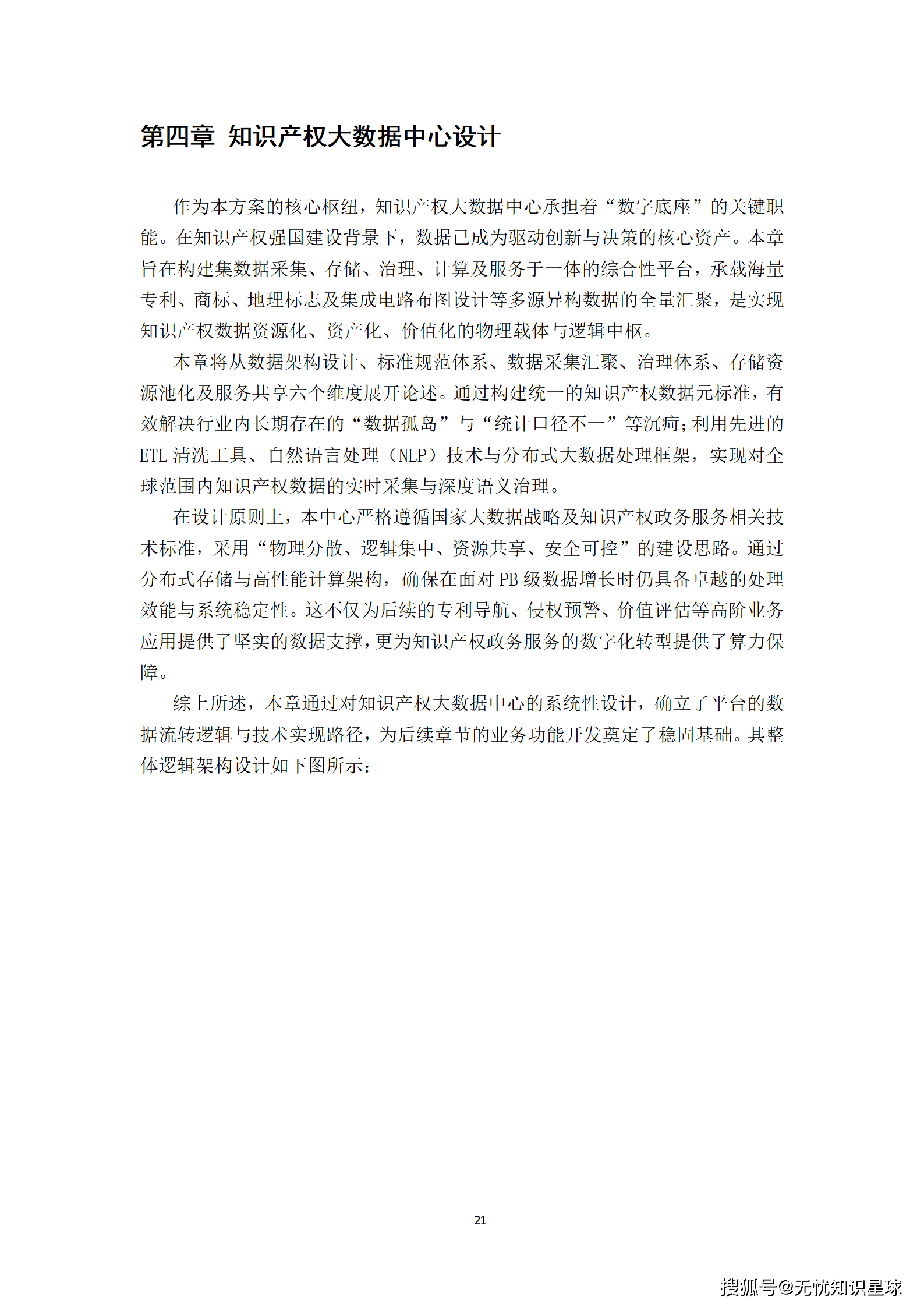本方案是一份针对政务数字化转型的“智慧知识产权大数据平台”超大型建设方案,适用于省市级知识产权局、市场监管部门及高新园区的重大信息化项目立项与顶层设计。适用于政府信息化主管、智慧政务架构师及项目申报团队。✓ **架构设计前瞻**:采用“一库一脑两翼”总体格局,深度融合AI监管大脑与区块链存证技术,满足等保三级安全合规要求。✓ **数据治理精细**:涵盖全球1.7亿条专利及6000万商标数据,详细规
