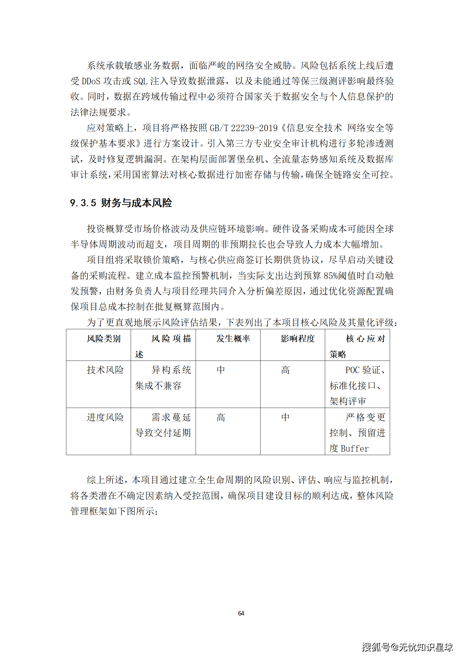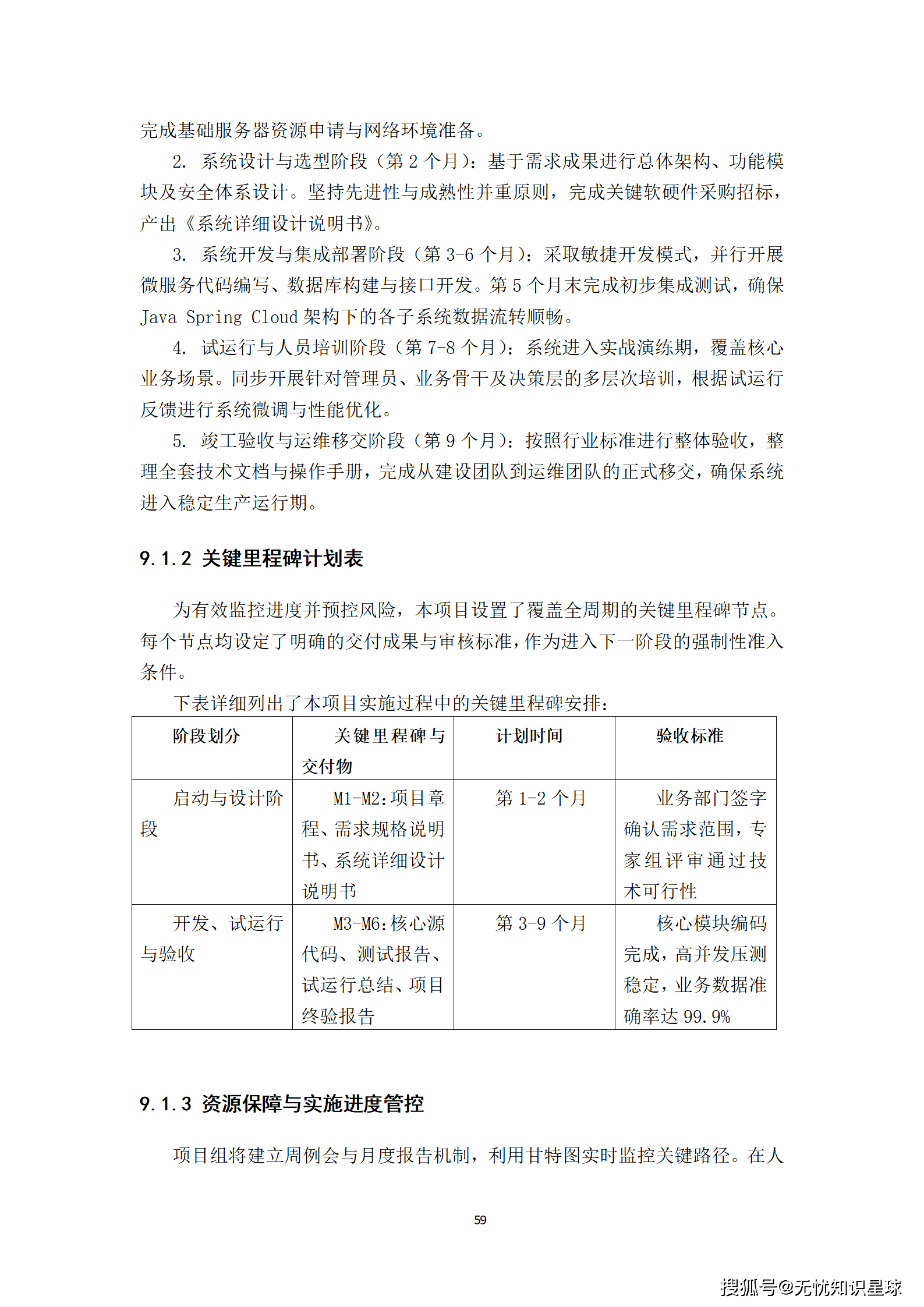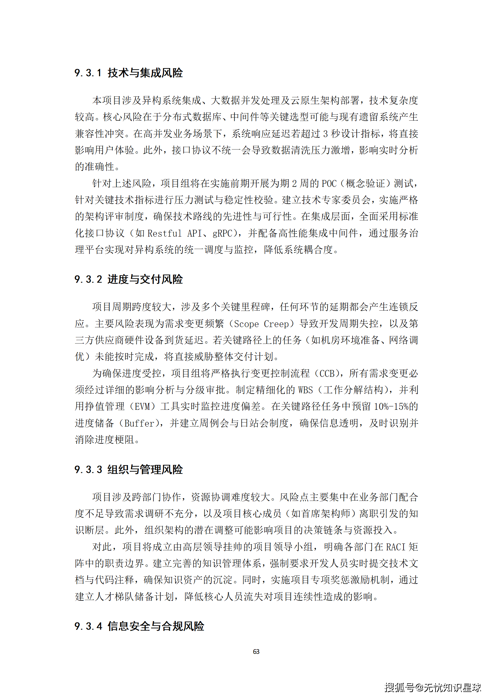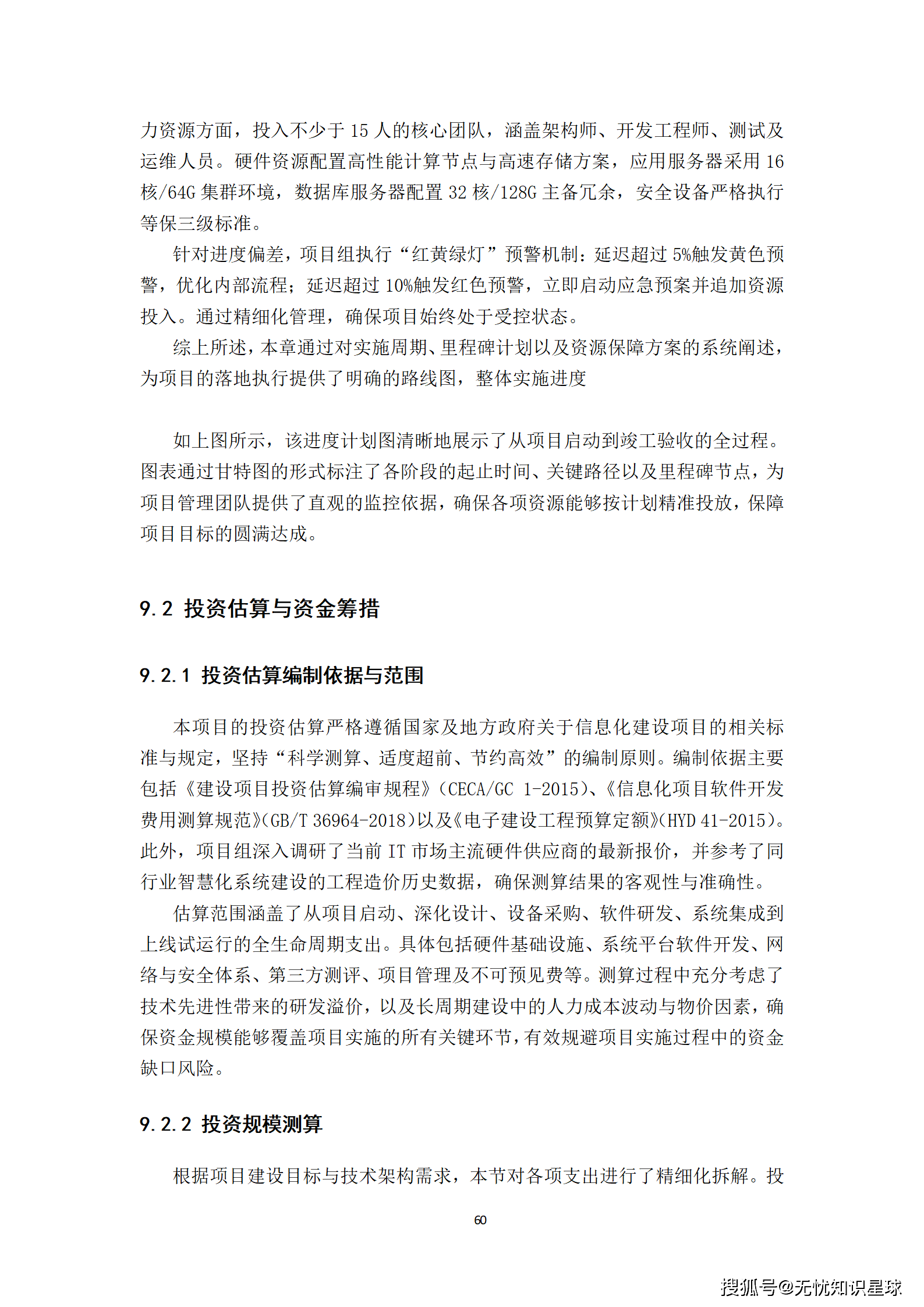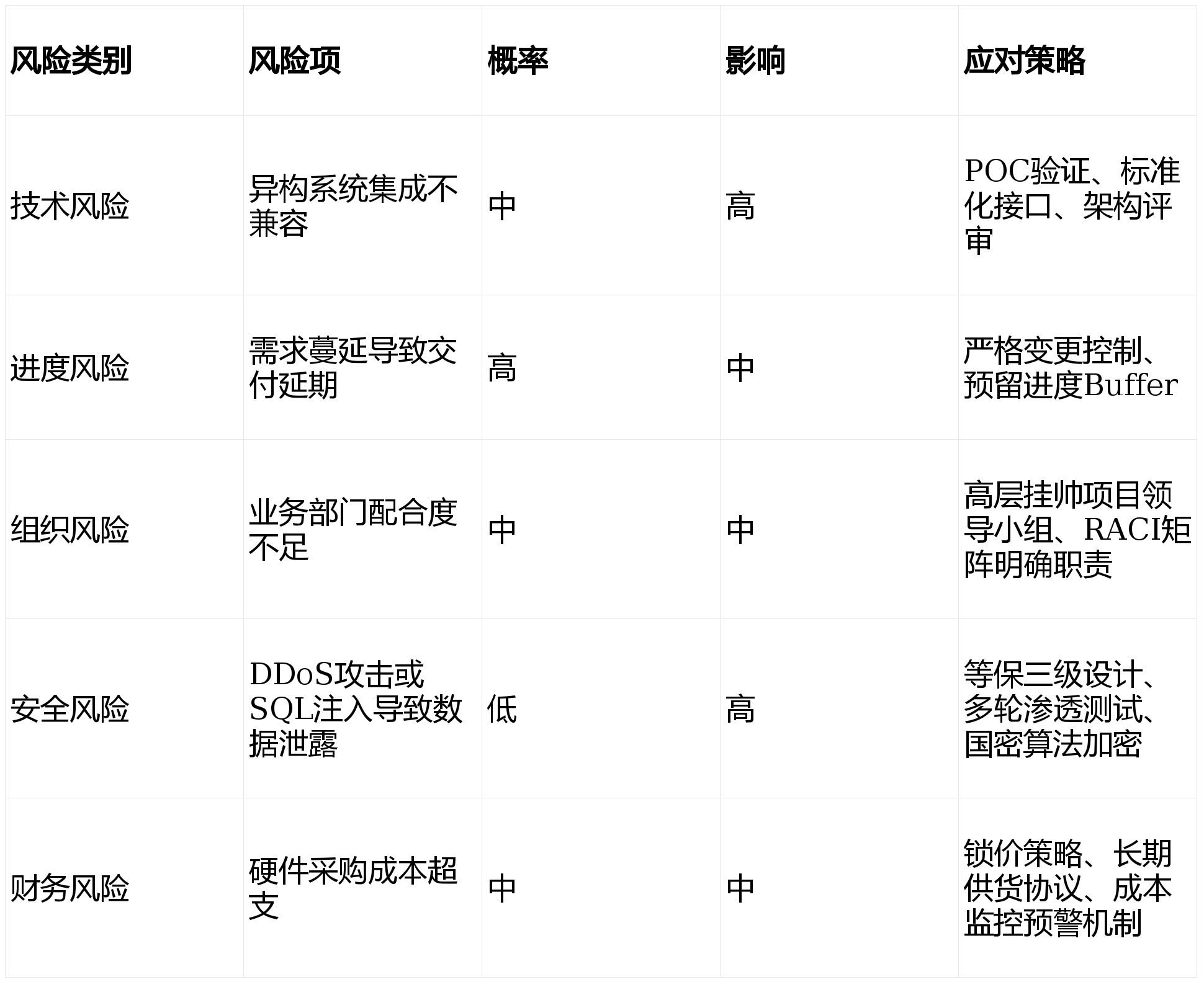 进度管控机制: 周例会+月度报告,甘特图实时监控,"红黄绿灯"预警机制(延迟>5%黄色预警,>10%红色预警启动应急预案)。