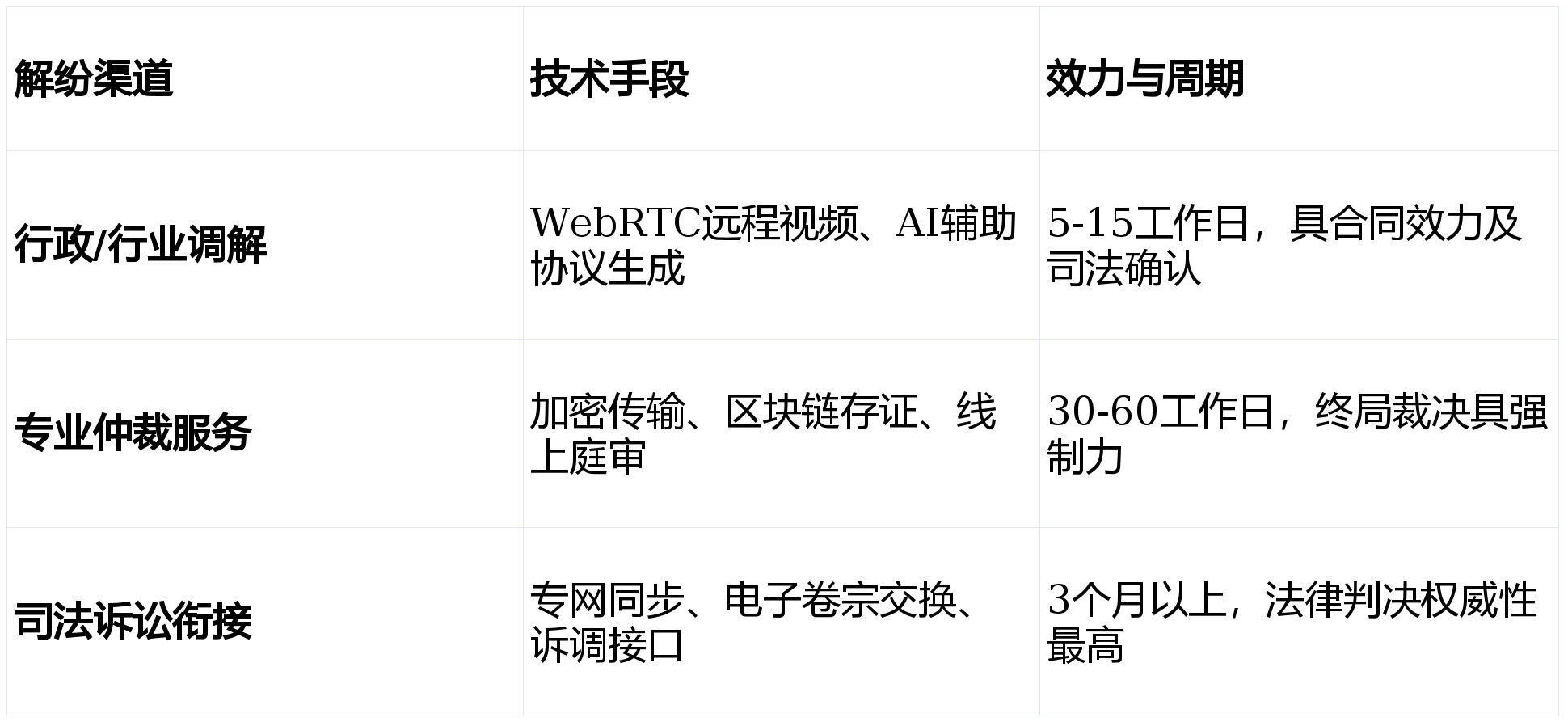 - 全流程线上化:咨询、调解、仲裁、证据交换云端完成