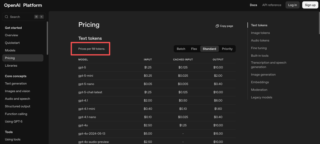 当你在浏览各大模型的官网或准备调用其 API 时,都会看到“价格”这一部分。大多数厂商的 API 定价是按 token 数量计费的,常见的计量单位是 1M tokens(即100万个 tokens)。在 OpenAI 的 API 中,费用会区分不同类型的 token,比如 文本 token(Text tokens)、图像生成与处理 token(Image tokens)、音频处理 token(Audio tokens) 等,调用时会根据实际消耗的 token 数量来收费。需要注意的是,API 调用的计费方式和 ChatGPT 产品的订阅模式并不相同:前者是按使用量精确计费,后者则是按月订阅或套餐形式收费。