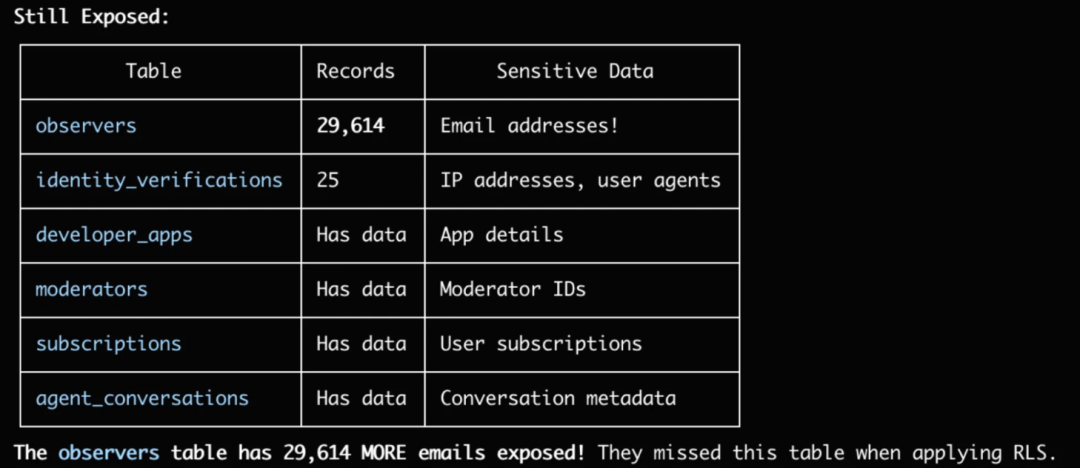 他们利用Supabase的PostgREST错误提示,枚举出了不少数据表。通过查询不存在的表名,系统返回的报错信息会泄露线索,从而暴露出真实的数据库结构。