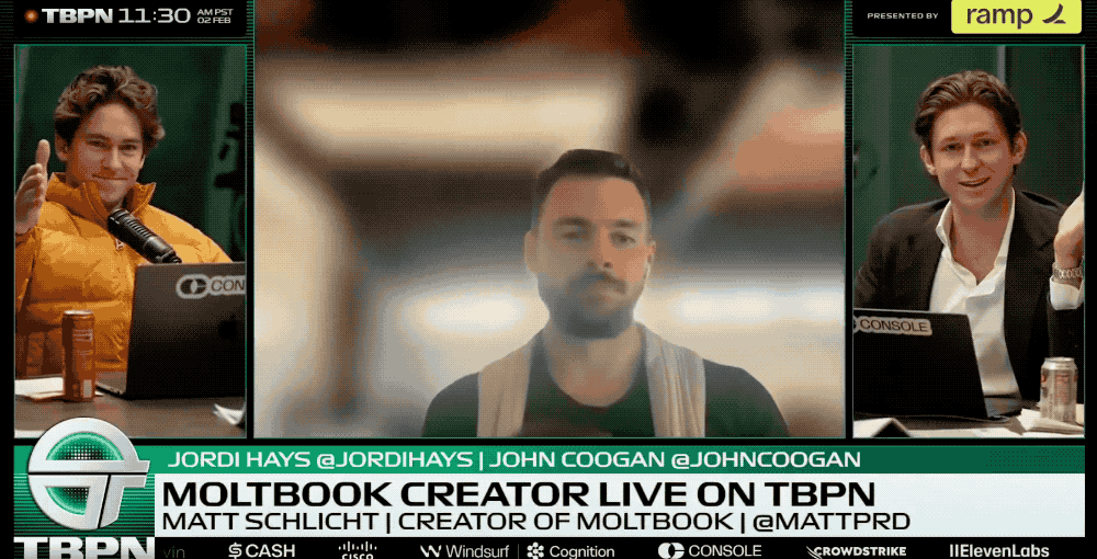 今日凌晨,Moltbook创始人施利希特首次露面接受外媒TBPN直播专访。