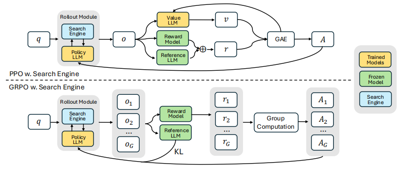 (1)RL框架与稳定性——如何将搜索引擎有效地集成到面向LLM的RL方法中,同时确保优化过程的稳定性,尤其是在引入检索上下文时,这一问题仍不明朗。