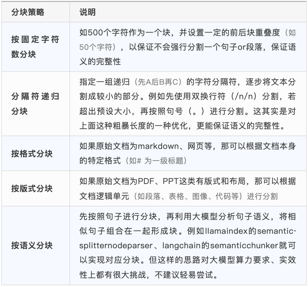 另外,分块的核心是“服务于检索”,因此在分块阶段,就要提前考虑后续的索引逻辑,做好衔接——这也是很多小白容易忽略的点,导致分块和索引脱节,影响检索效果。