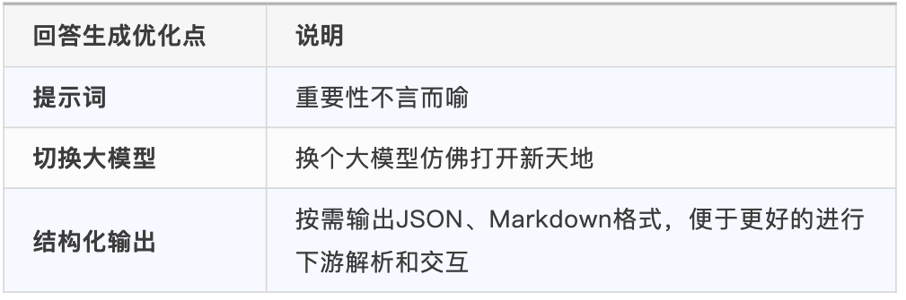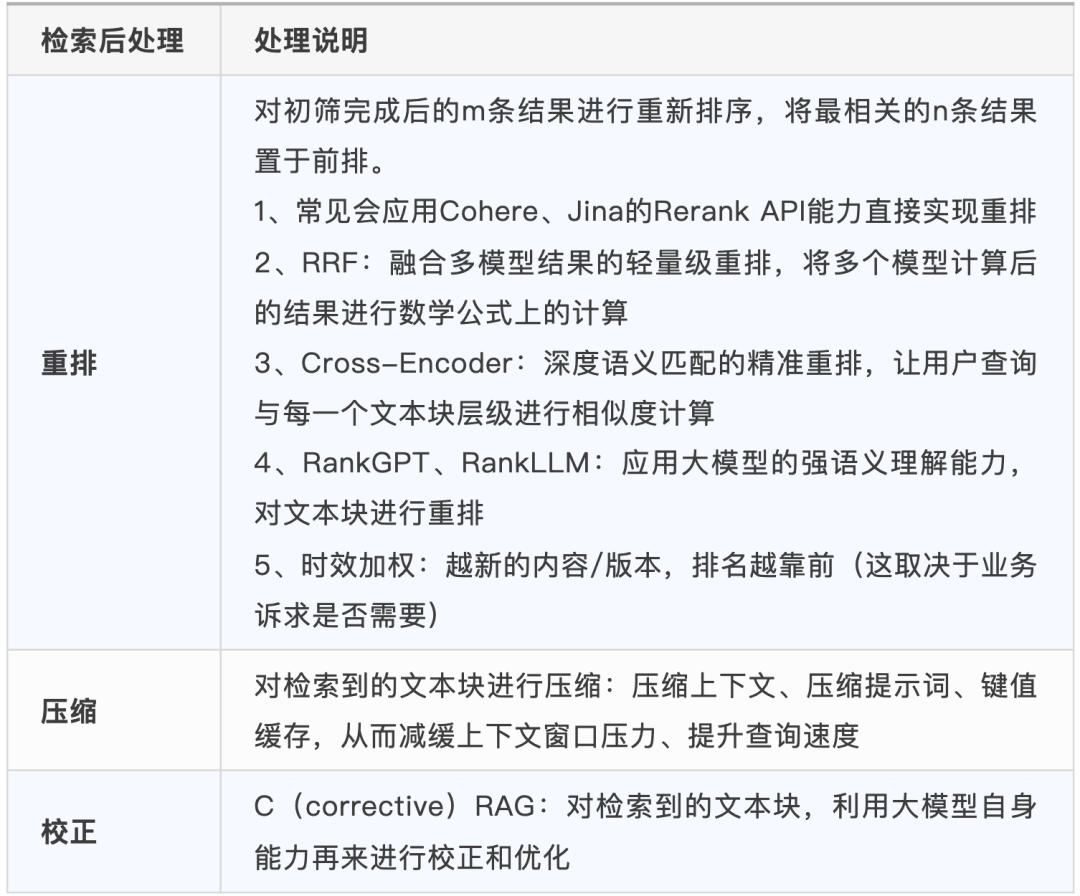 检索完成后,会得到一批召回的知识块,此时需要对这些知识块进行优化,剔除无关内容、提升相关性,为后续回答生成铺路。常见的优化策略如下(小白可直接套用):