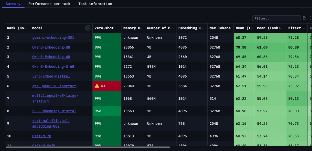 截至目前,多语言embedding模型中,排名第一的是gemini-embedding-001,而第二、三、四名都是阿里的Qwen-Embedding系列,性价比和适配性都很出色,尤其适合中文场景,小白可优先测试选用。