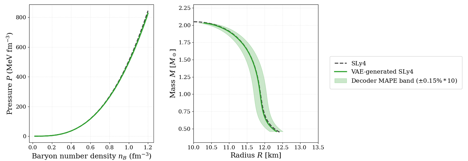 华盛顿大学团队在预印本发表该研究,提出结构化 VAE 框架生成中子星状态方程(EOS)。模型将传统 10 参数 Skyrme 模型压缩为 3 个参数Mmax、R1.4与 1 个潜在变量,生成的 EOS 与 SLy4 模型高度吻合,Mmax和R1.4的平均绝对百分比误差均仅 0.15%。该框架可快速生成物理合理的 EOS,为引力波解读、中子星属性分析提供高效工具,显著降低 EOS 的不确定性。