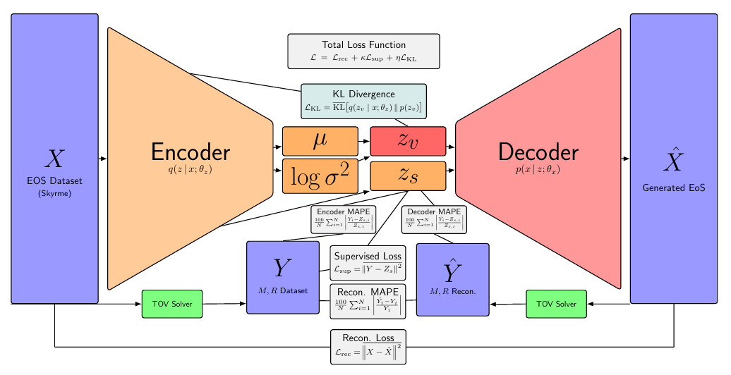 研究提出结构化 VAE 框架生成中子星状态方程(EOS),将传统 10 参数 Skyrme 模型压缩为 3 个参数Mmax、R1.4与 1 个潜在变量,生成的 EOS 与 SLy4 模型高度吻合,Mmax和R1.4的平均绝对百分比误差均仅 0.15%。