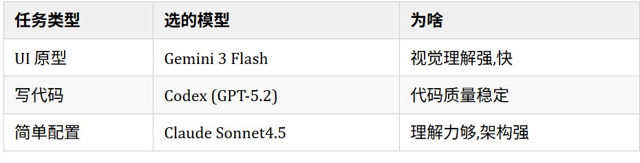 这个策略是实测出来的。一开始全用 Claude,后来发现 UI 类任务 Gemini 更快更便宜,代码类任务 Codex 更稳定。