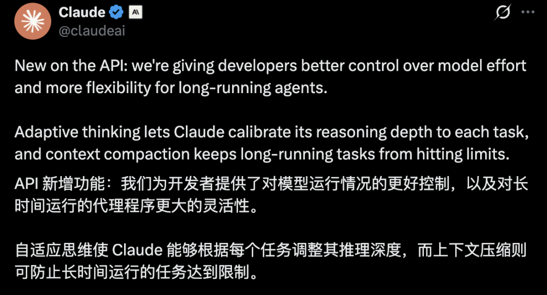 通过「Adaptive Thinking(自适应思维)」,模型可以根据任务复杂度动态调节推理深度;同时配合「 Context Compression(上下文压缩)」,在长时间运行中主动精简历史信息,避免上下文越堆越厚,最终撞上长度上限直接翻车。