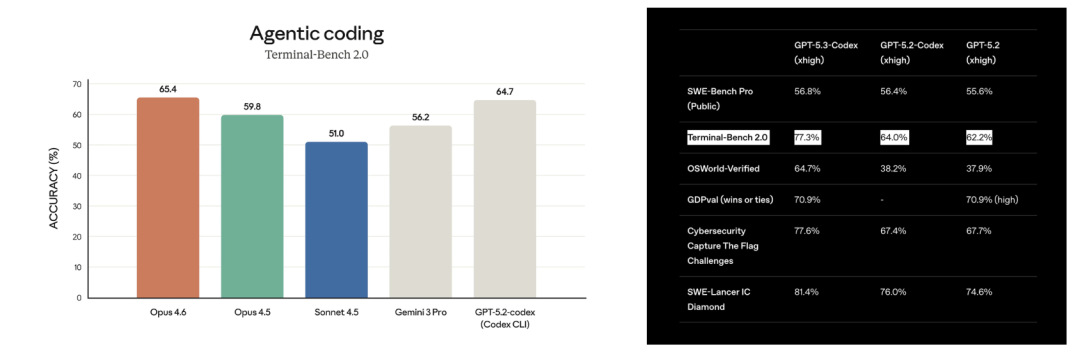 公开跑分里,Opus 4.6 和 GPT-5.3-Codex 目前唯一相同,可以正面对打的 benchmark,只有 Terminal-Bench 2.0。