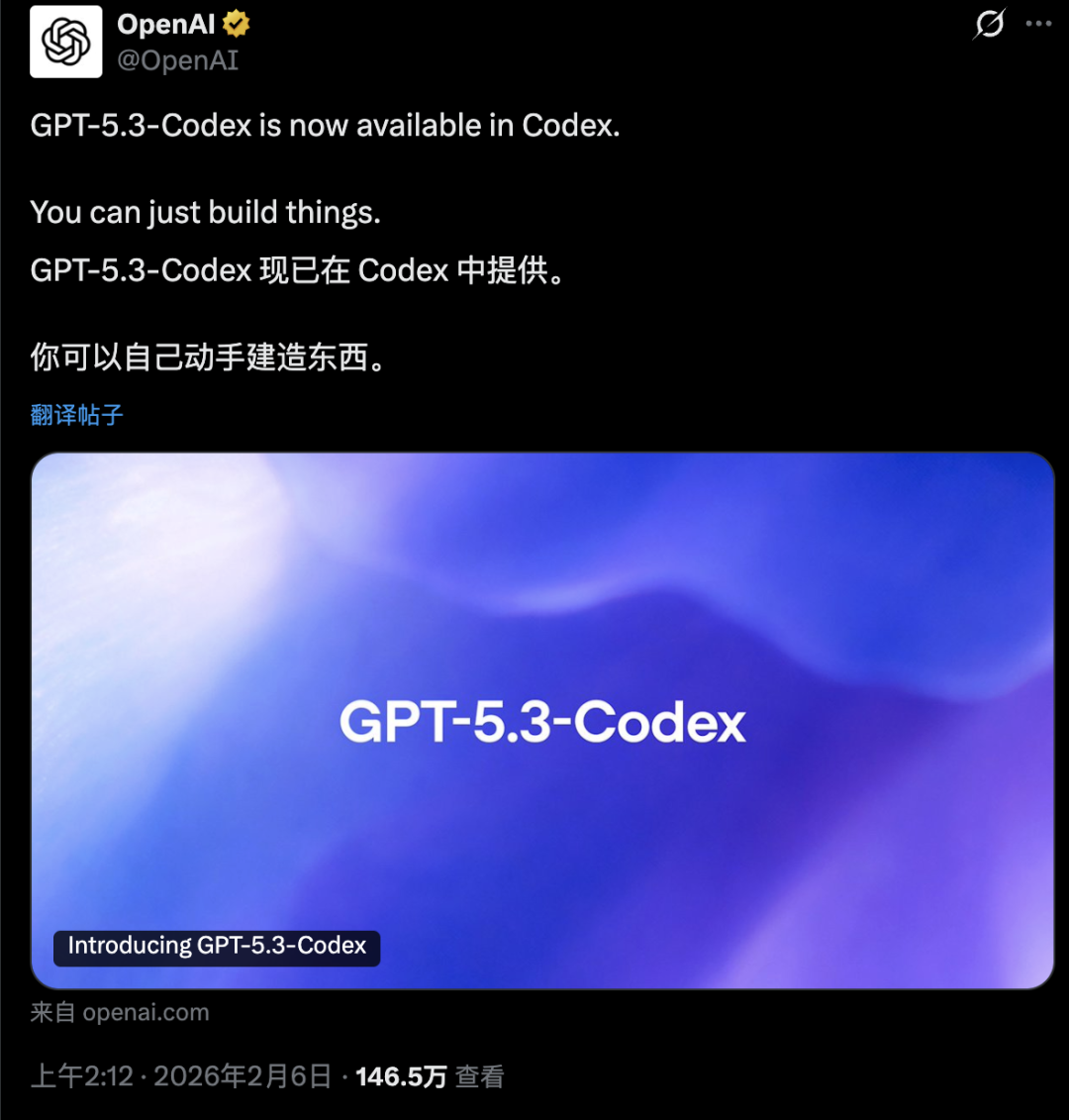 OpenAI 也不甘示弱,没过几分钟立马甩出了 GPT-5.3-Codex。