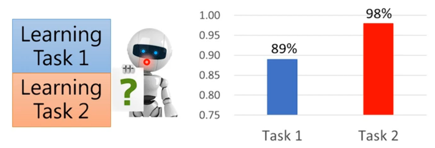 任务一学完之后,再让同一个模型继续去学任务二(在学习完的基础后再通过任务二的数据继续更新),学习完任务二之后得到再任务二上其正确率达到了97%,但是可以发现这个模型忘了如何取做任务一了,任务一的正确率掉到了80%。这里我们可以通过说内存有限来进行辩解。