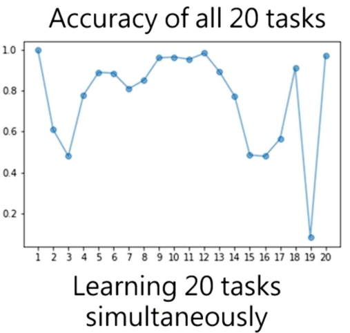 但是如果同时学习这20个任务,这时正确率并不是指指定的某个任务的正确率,而是横坐标对应任务的正确率。虽然有个别任务学不会,但是其还是可以同时学会好几个问题,并且正确率也是不低的。