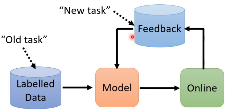 虽说对于做出天网一样的AI还是遥远,但是对于这一终身学习思想在我们目前的应用中也是能够派上用场的。就如若在实验室中开发出某一个模型,并通过收集到的资料来训练这个模型,模型训练出来并上线之后,其会取得来自使用者的反馈。