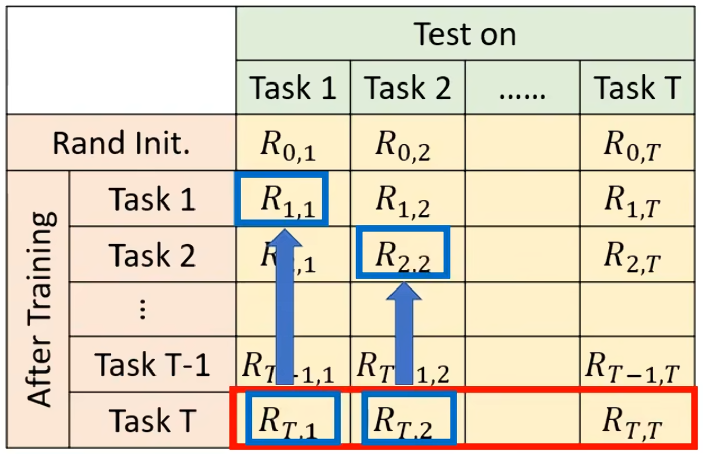 上边有一排的任务,先有个随机初始化的参数Rand Init,将其用在这T个任务上,得到T个正确率,接下来向下让模型先学第一个任务之后再在这T个任务上看正确率,接下来都是学习完有个就去对T个任务看正确率,直到最后有个任务T学习完成并测T个任务的正确率。