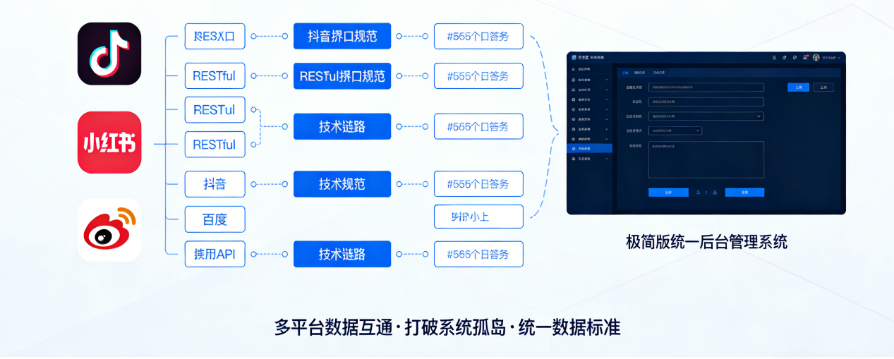 1. 渠道系统孤岛化:抖音、小红书、百度等主流投放平台的后台系统相互独立,API接口规范不统一、数据格式不兼容,运营及技术人员需反复切换系统完成投放操作,不仅大幅降低投放效率,还易因系统操作差异、数据口径不一致出现数据误差,增加技术对接成本。