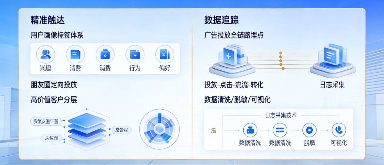 3. 大数据精准触达技术:整合多平台用户行为数据、社交数据、消费数据等,基于大数据分析技术构建多维度用户画像标签体系(涵盖用户兴趣、消费能力、行为习惯、需求偏好等),实现高价值客户的精准识别与分层。尤其在朋友圈等社交平台定向投放环节,通过打通社交平台用户标签数据,实现广告内容的精准推送,提升广告点击率和转化效率,解决“大海捞针”式投放的技术痛点。