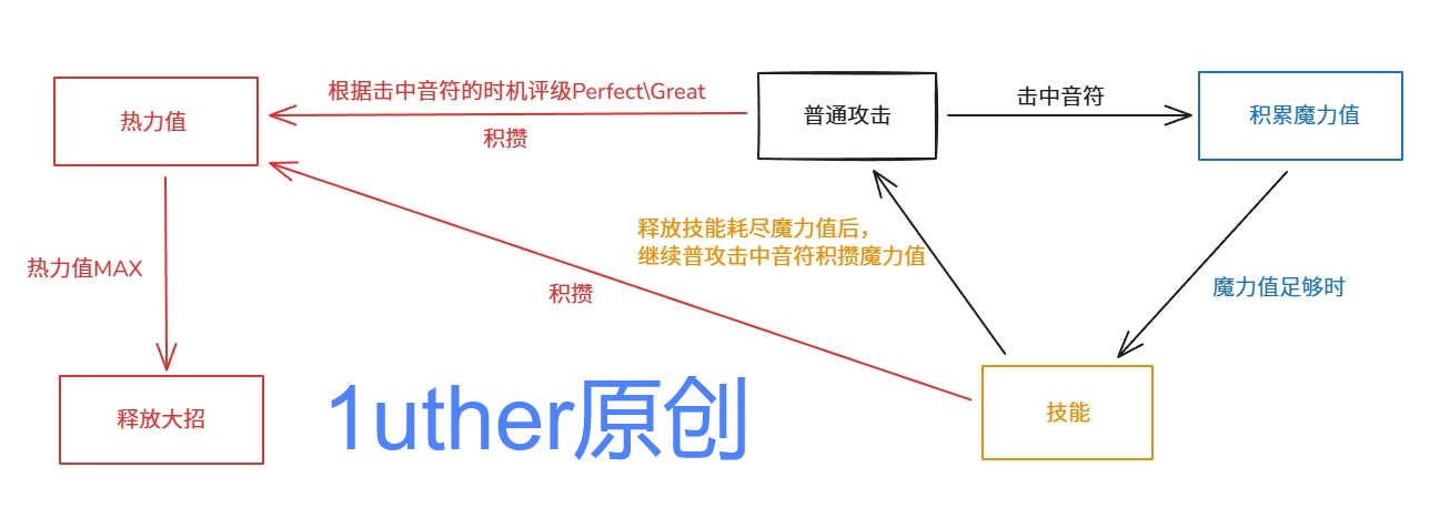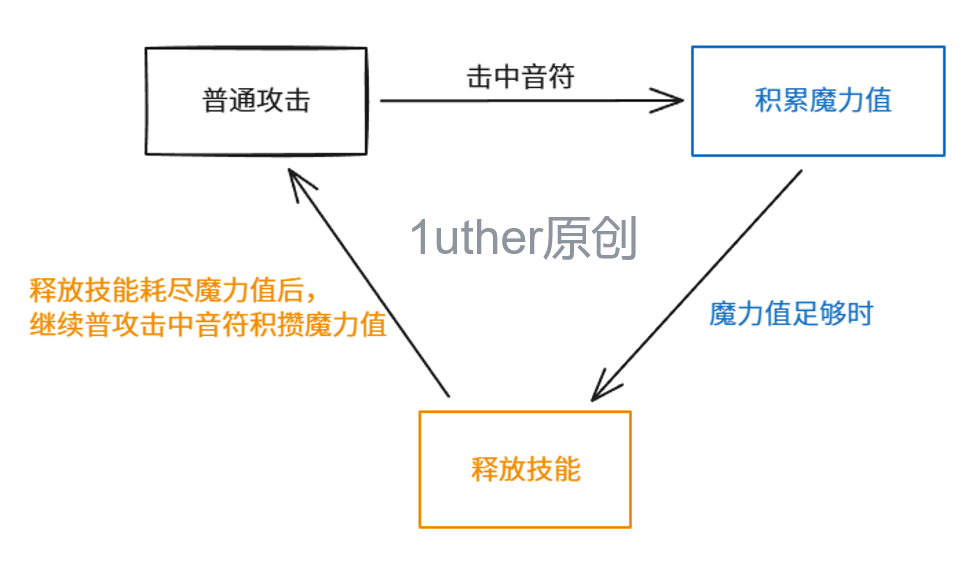 根据我之前的《绝区零》战斗系统拆解分析案-CSDN博客里的”循环“思路,我认为将游戏音乐变成玩家操作中重要一环的方法就是把游戏音乐融合进战斗循环中,并以它为核心增加正反馈机制,拓展消耗战斗资源的策略性和玩法深度。