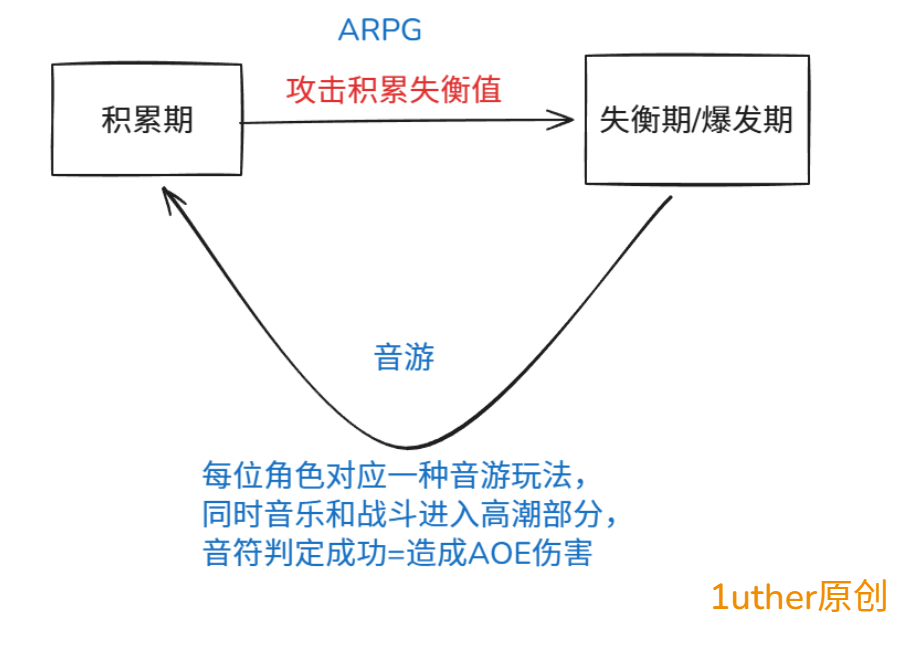 在“积累期”中玩家的操作与ARPG的操作一致,任何对boss的攻击都会积攒失衡值。当失衡值满时,怪物进入失衡期处于瘫痪易伤状态,进入失衡期后玩家的操作会从ARPG变成各种音游玩法(每位角色对应一种音游),同时音乐进入高潮,伤害变成AOE,标志着游戏也进入高潮。失衡期结束后,boss恢复正常状态,玩家操作也从音游玩法回到正常的ARPG操作。