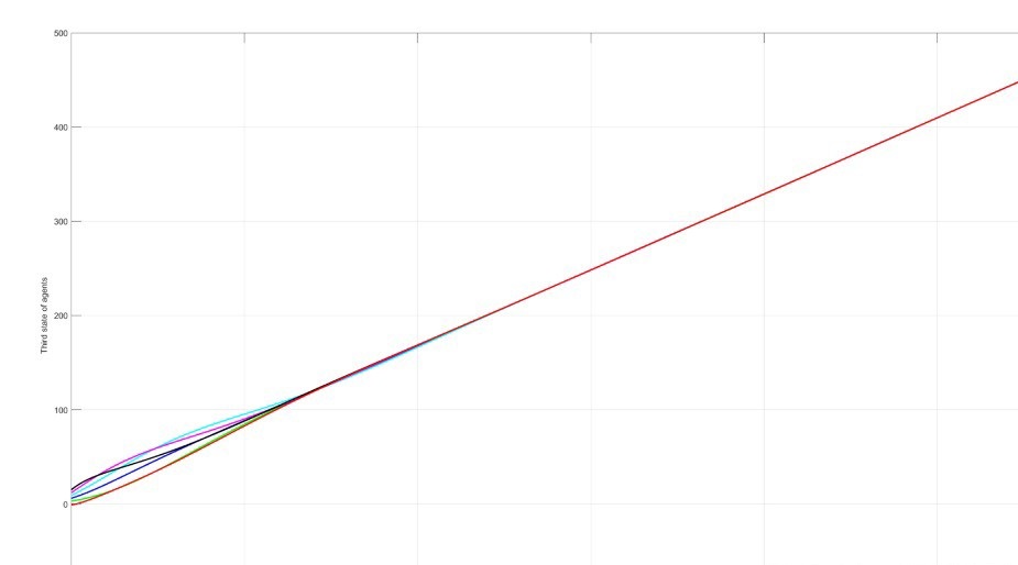 运行上述代码,可以看到每个时间步的编队位置。通过事件触发机制,系统能够根据实际情况动态调整控制策略,从而保证编队的一致性。最终,所有智能体的编队位置都收敛到原点,说明系统达到了一致性的目标。