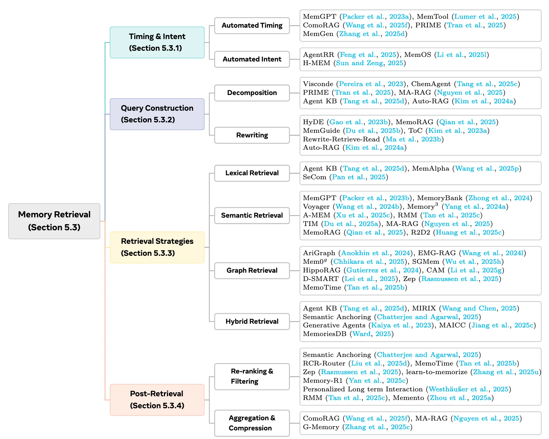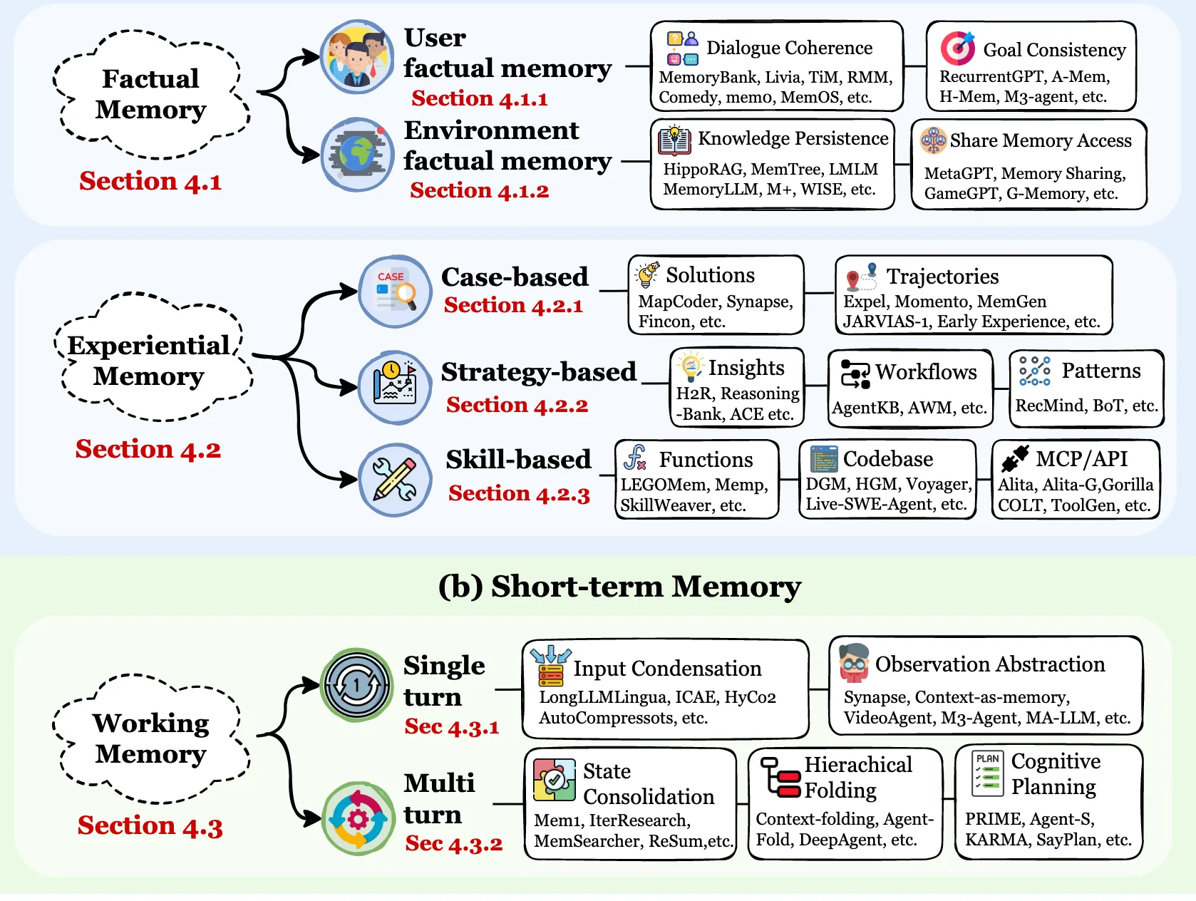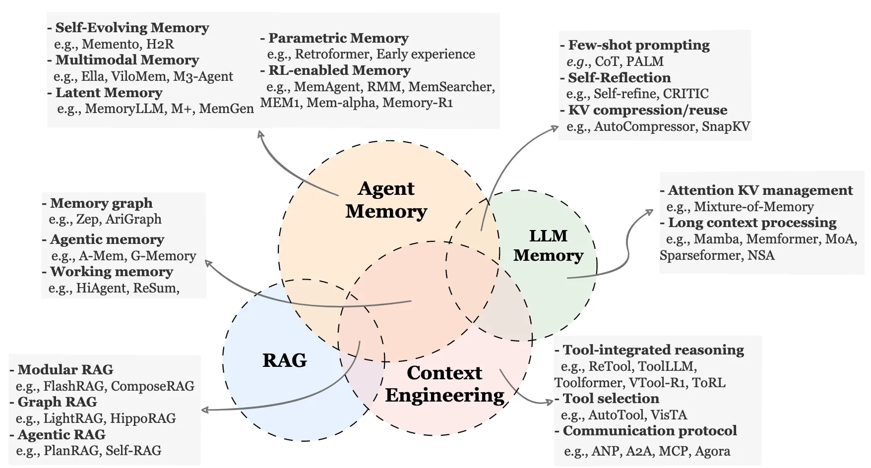 首先论文中指明了当前Agent memory领域主要有什么研究方向,从下图可以看出,这个领域中研究方向很多,我们逐一拆解