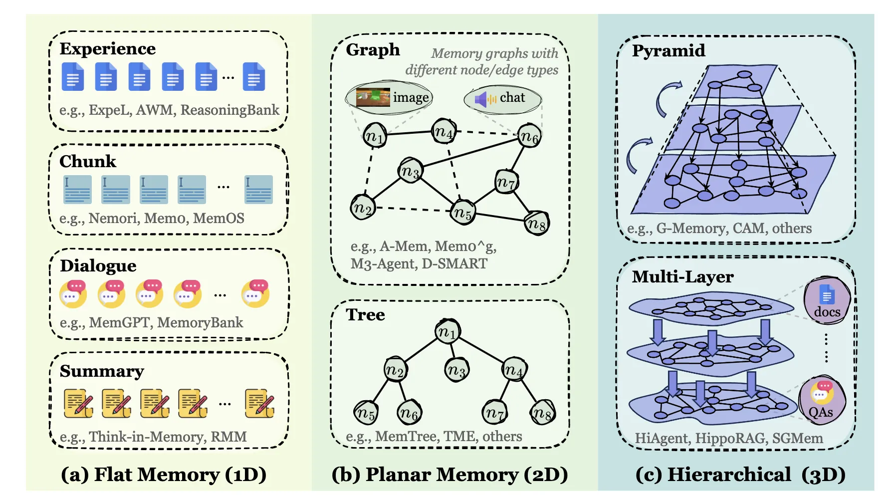 该范式将连续的文本跨度或离散的记忆项作为节点,在保持局部语义完整性的同时将其组织成拓扑结构。该领域的发展经历了从静态的、平面的( 2D )从固定语料中提取,到动态地适应新的轨迹,最终发展到分层的( 3D )架构。