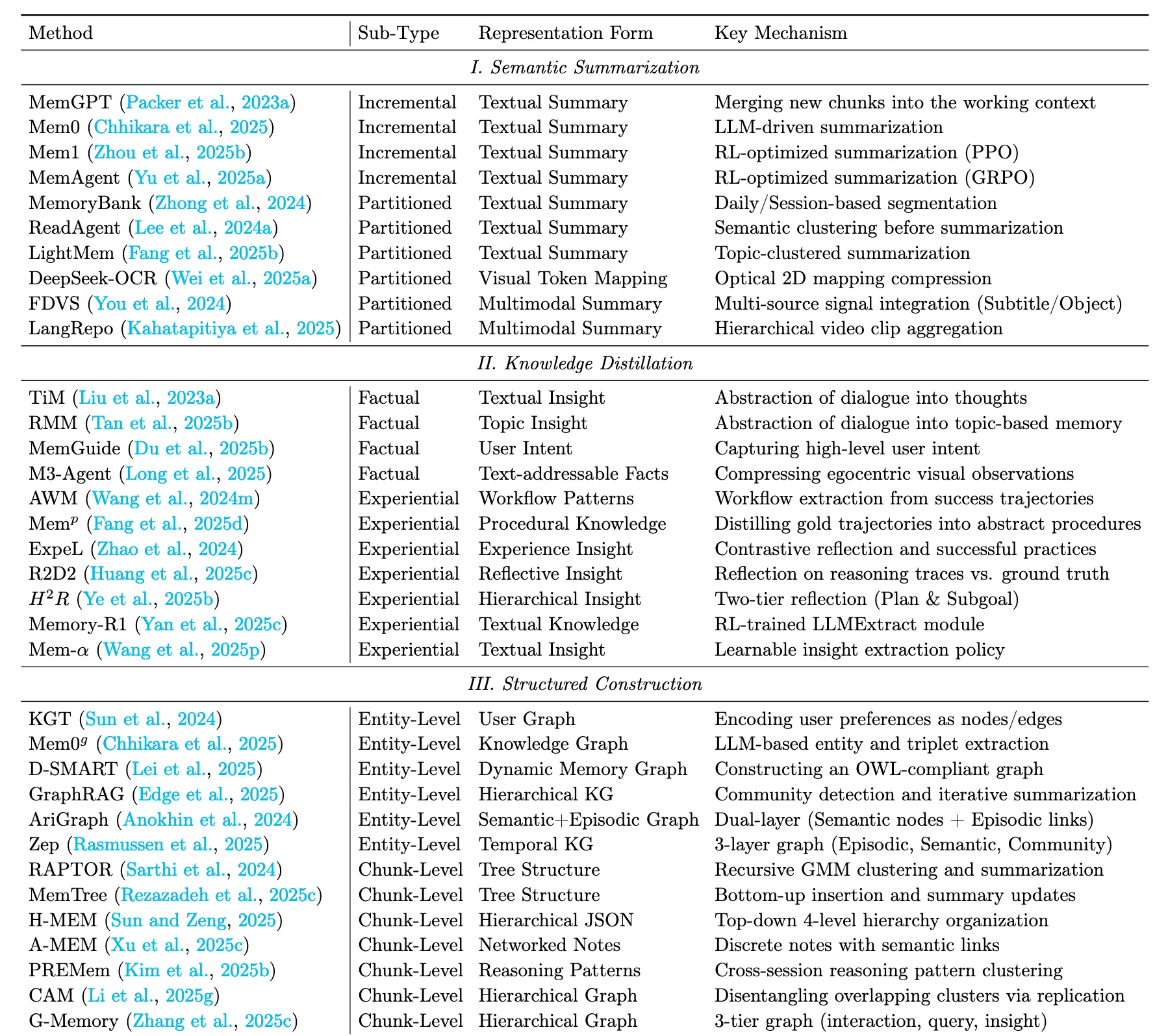 Summary:The main advantage of structured construction is explainability and the ability to handle complex relational queries. Such methods capture intricate semantic and hierarchical relationships between memory elements, support reasoning over multi-step dependencies, and facilitate integration with symbolic or graph-based reasoning frameworks. However, the downside is schema rigidity: pre-defined structures may fail to represent nuanced or ambiguous information, and the extraction and maintenance costs are typically high.