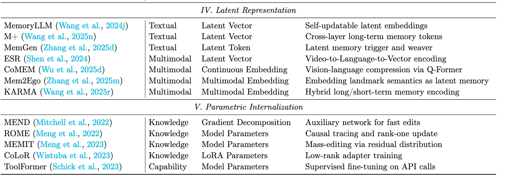 - 潜在/参数记忆:将经验编码为模型内部的向量或直接调整模型参数。