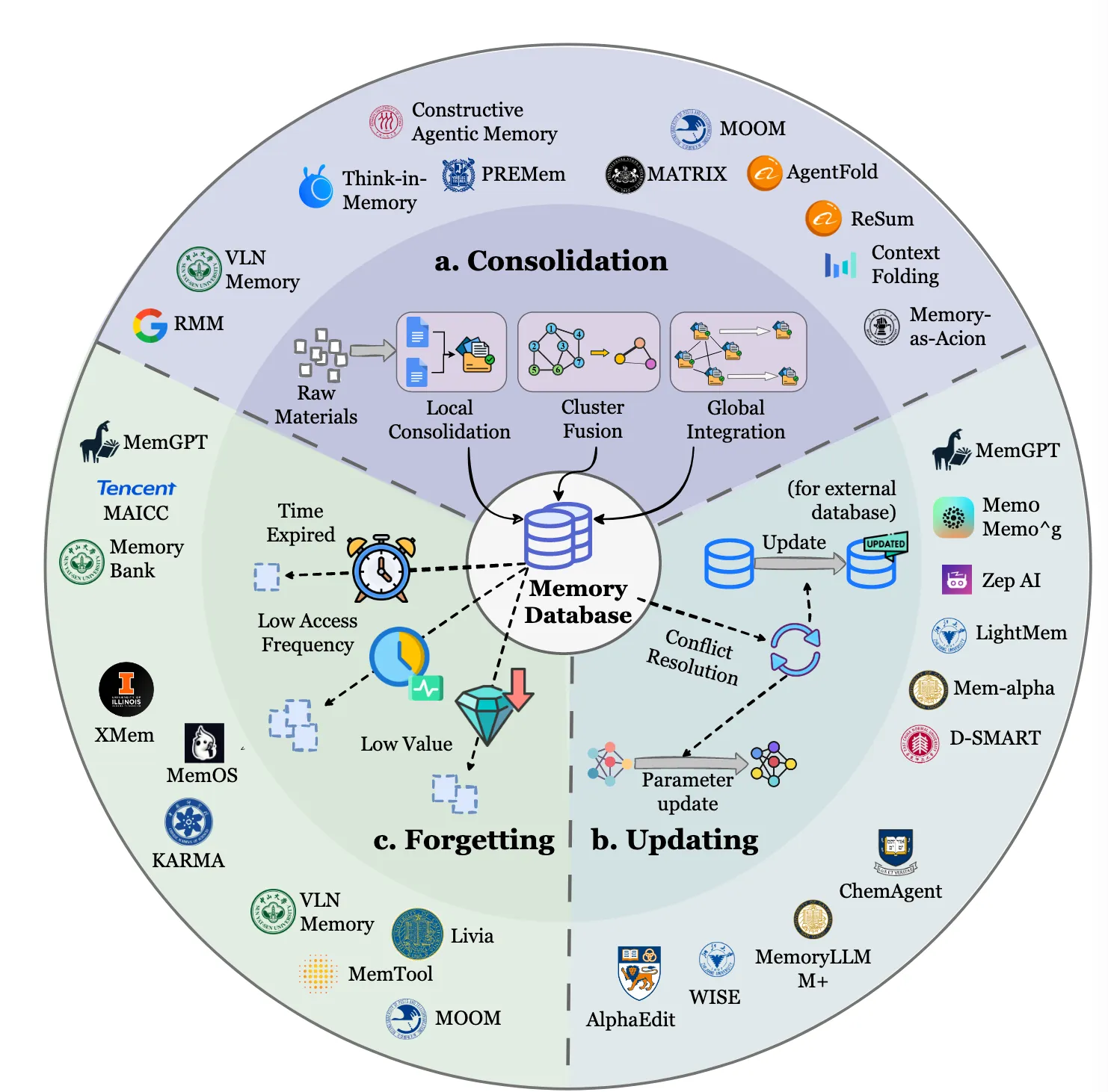 Summary:From an implementation standpoint, memory updating focuses on resolving conflicts and revising knowledge triggered by the arrival of new memories, whereas memory consolidation emphasizes the integration and abstraction of new and existing knowledge. The two memory updating strategies discussed above establish a dual-pathway mechanism involving conflict resolution in external databases and parameter editing within the model, enabling agents to perform continuous self-correction and support long-term evolution. The key challenge is the stability–plasticity dilemma: determining when to overwrite existing knowledge versus when to treat new information as noise. Incorrect updates can overwrite critical information, leading to knowledge degradation and faulty reasoning.