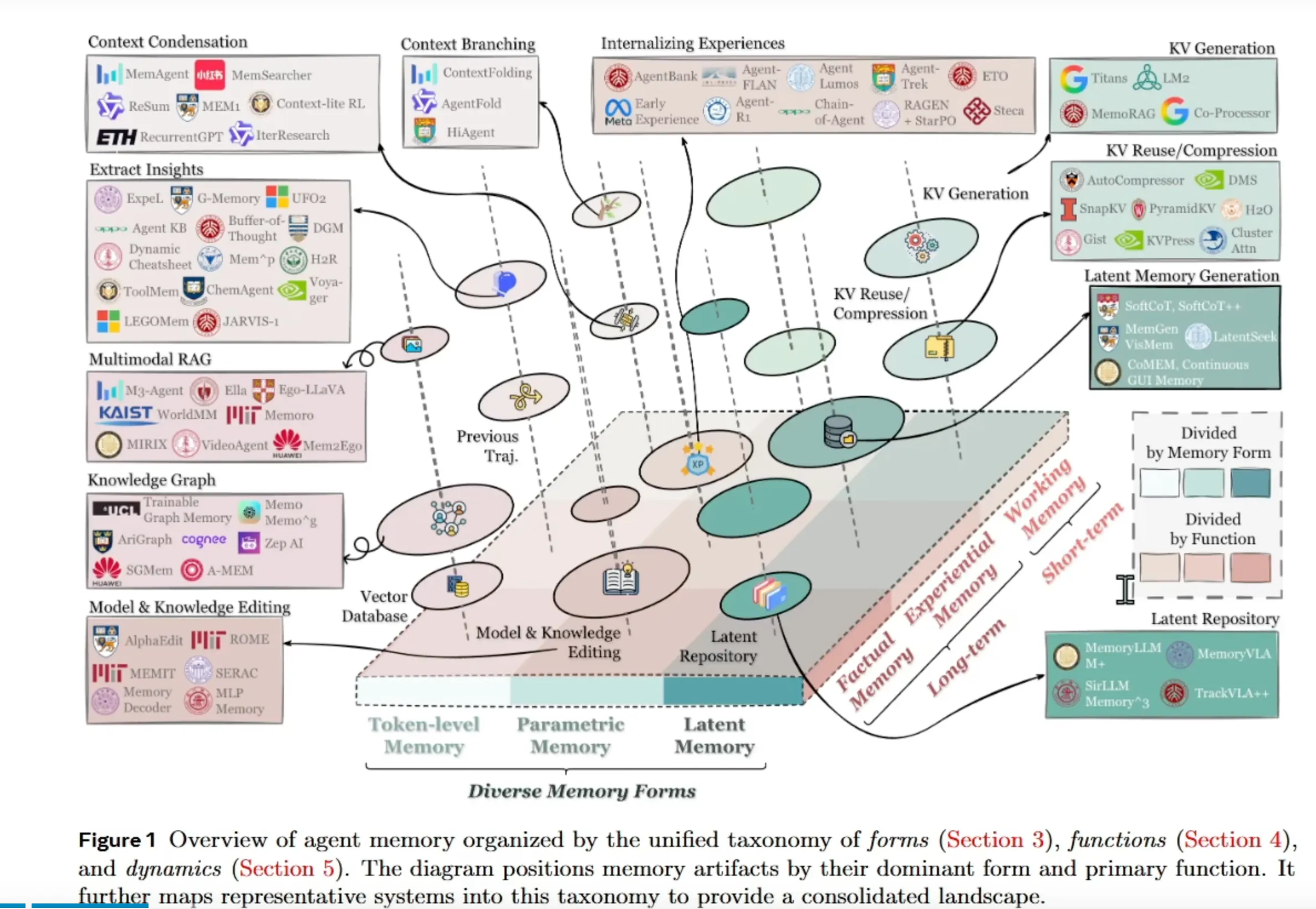 图的价值在于:它将数十个看似独立的AI智能体系统和记忆模块(如 G-Memory , Buffer-of-Thought , JARVIS-1 等)整合到一个统一的框架中,让研究者一眼就能看出某个系统“用哪种形式的记忆,主要解决什么问题”。