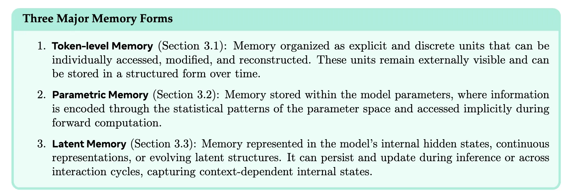 - 动态(Dynamics):记忆如何被操作、更新和演化?(第5节)