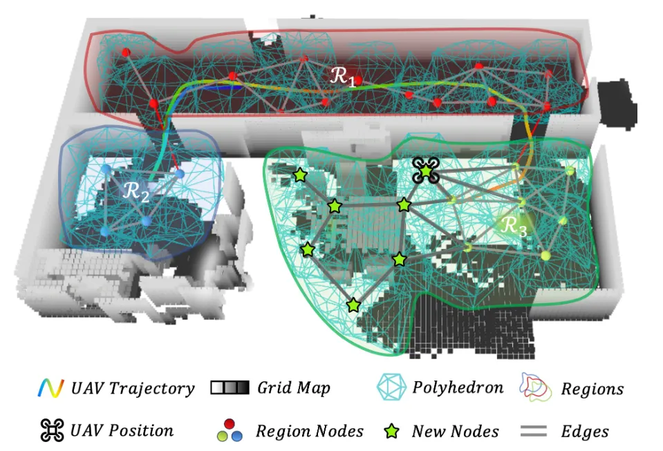 值得注意的是,论文将“变形状态”和“飞行模型”统一纳入系统建模中,使机器人在抓取物体、受到外界干扰时,依然能够保持稳定飞行,这是后续复杂操作能够顺利完成的关键基础。无人机执行一些飞行巡航任务,已经很成熟了,航拍、测绘、巡检,几乎成了默认工具,在第一项工作之中,无人机甚至能够找到我们所需要的物体。不同于常见的体素地图或稠密点云,这里使用的是一种基于 多面体扩展 的方法:无人机在局部占据栅格中,以当前