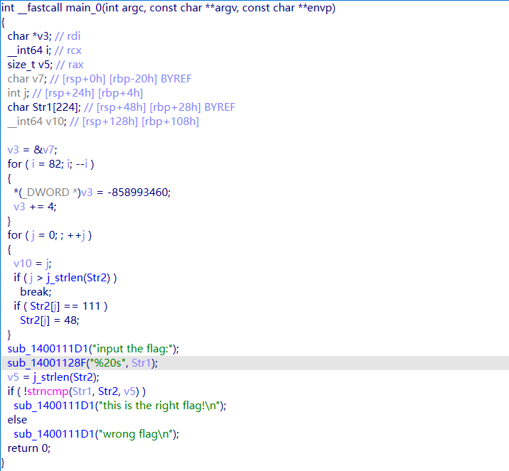 char Str1[224]; // [rsp+48h] [rbp+28h] BYREF /***存储用户输入的flag(224字节缓冲区)