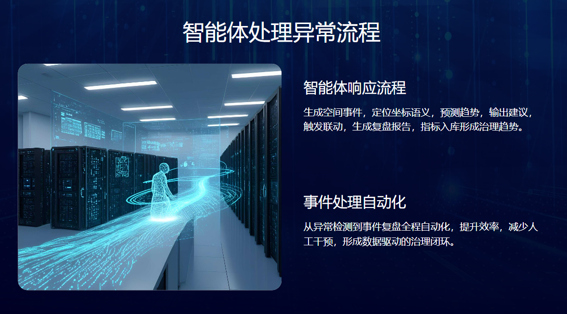 异常出现 → 智能体生成空间事件对象 → 自动定位到空间坐标与结构语义 → 预测扩散/冲突趋势 → 输出处置建议并触发联动 → 事件收敛后自动生成复盘报告 → 指标入库形成治理趋势