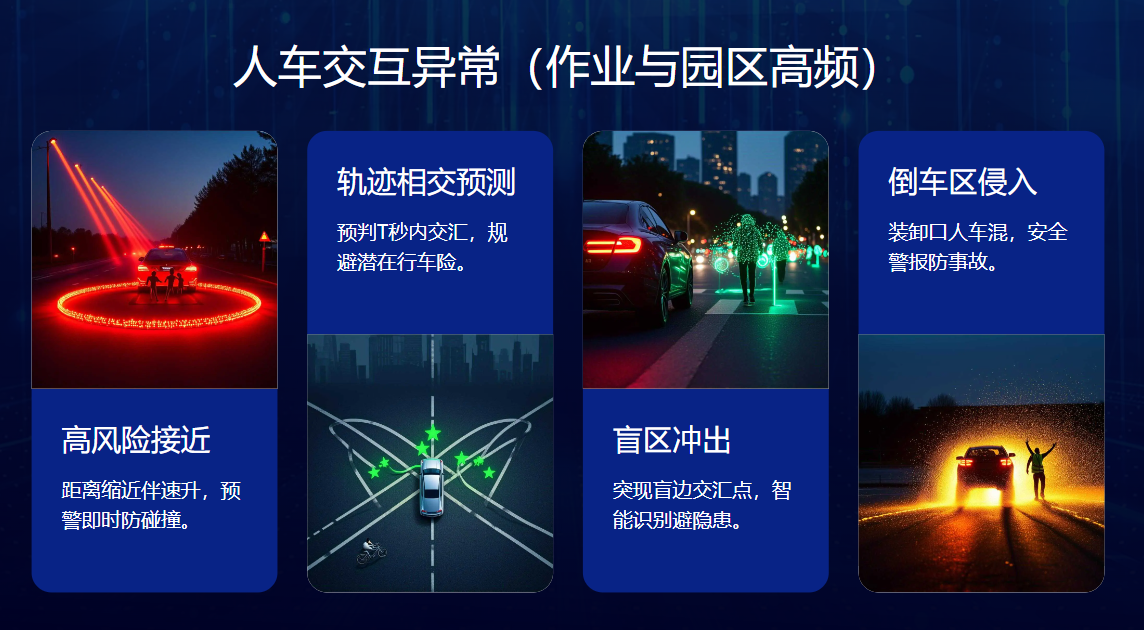 应支持越界侵占、异常停留、逆行横穿、人车高风险接近、轨迹相交预测、盲区冲出、异常聚集与拥堵扩散等异常类型(可按场景配置)。