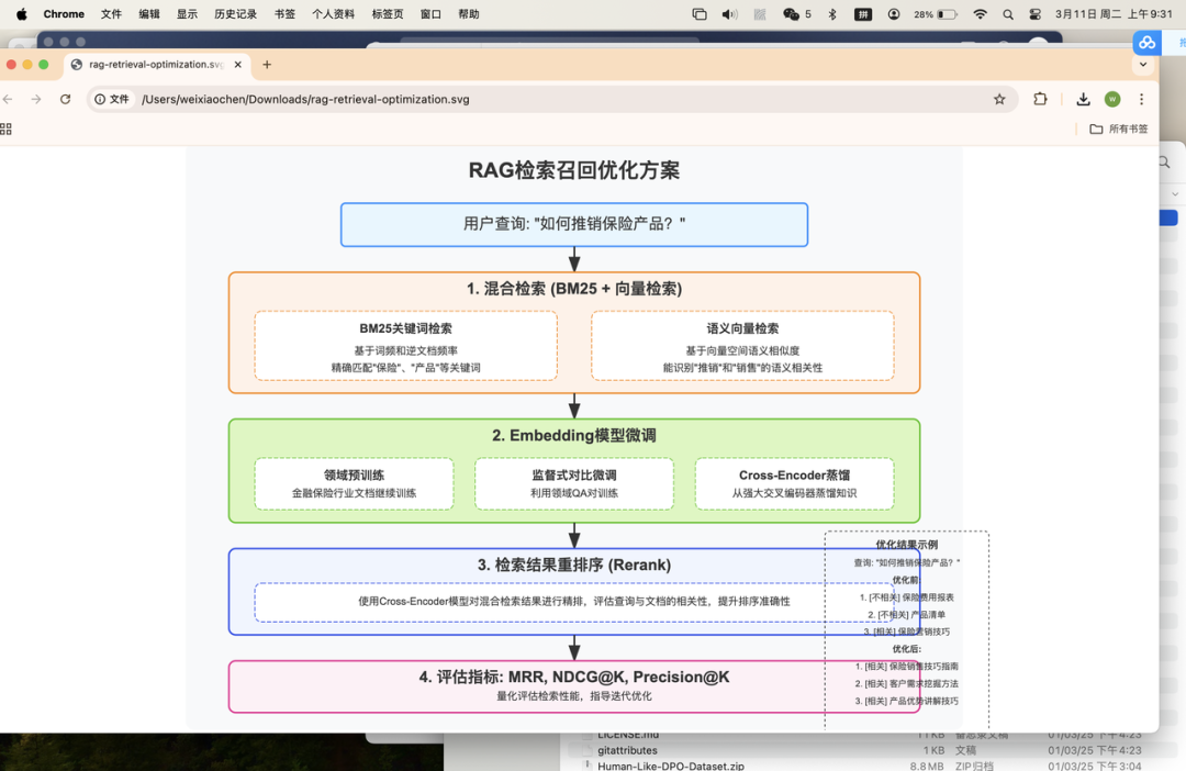 每个优化点相辅相成:混合检索和模型微调侧重提高召回率,重排序侧重提升准确率,最终使RAG问答系统能更准确地找到并提供答案。在实际落地时,应根据指标反馈不断调整策略,例如调整BM25与向量结果权重、增加训练数据微调Embedding、引入更强大的重排模型等,以持续优化用户提问的解答效果。通过完整的方案和持续评估,我们有信心显著改善金融保险场景下RAG问答系统的性能,提升用户满意度。