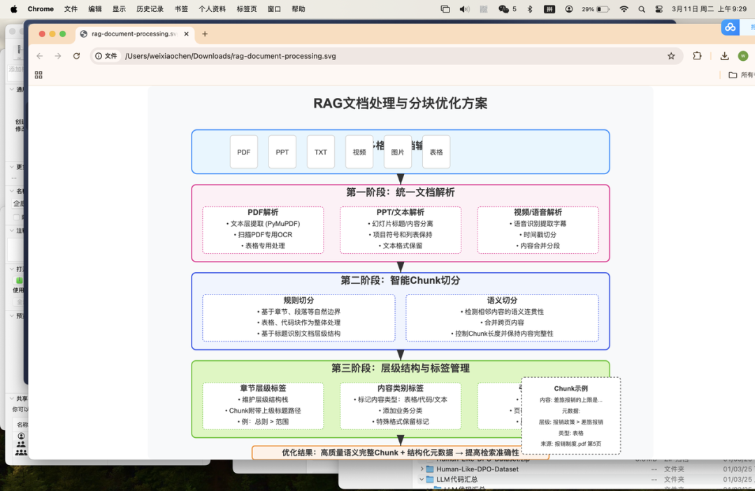 PDF/PPT:提取文字内容,保留章节标题、表格数据等结构信息,将长文档按段落或页面切分成知识片段(chunks),并为每个片段添加文档名称、页码/幻灯片编号等元数据。