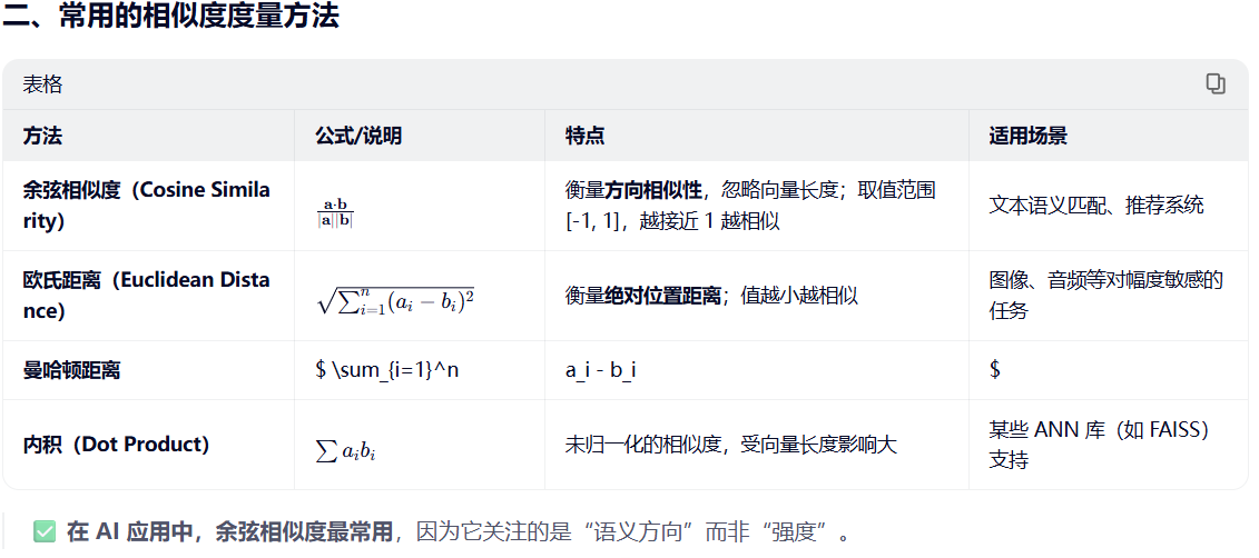 - 相似度计算/语义搜索:将查询和文档全部转换为向量,构建向量数据库进行近邻检索;