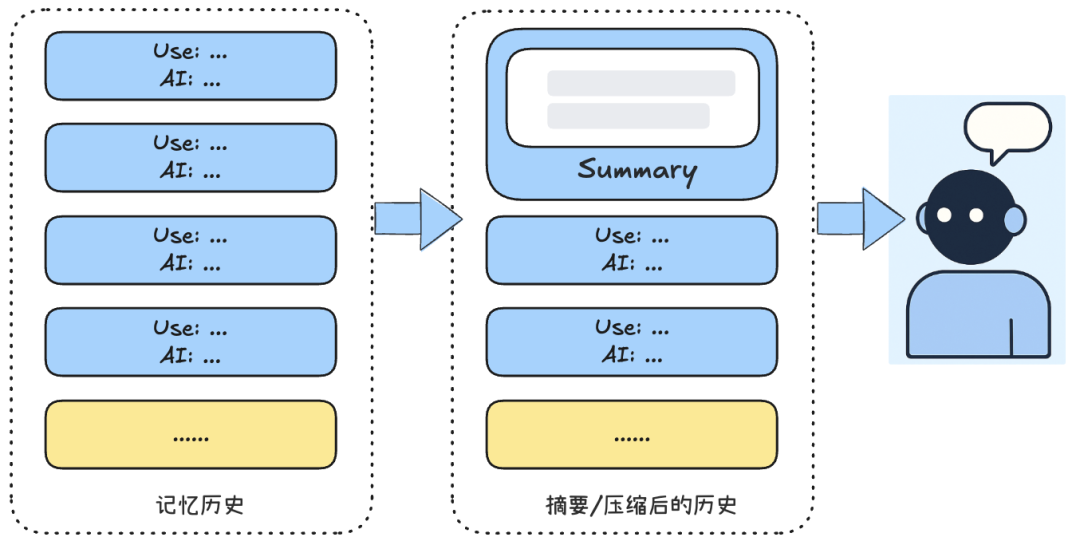 这里示意了一种运行摘要的机制:持续累计和更新一个摘要来代表早期的对话历史。每当记忆长度超标,就把早期内容做摘要和压缩,再与后续对话共同作为新的上下文 。这样,模型上下文始终包含“近期对话 + 旧对话摘要”。