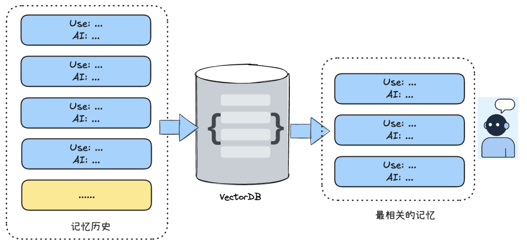 将每次对话嵌入后存入向量数据库如 Chroma、Pinecone 等 。当需要记忆时,把当前对话内容也向量化,并在数据库中搜索语义相近的记忆片段,将最相关的若干条取出,添加到模型的上下文。模拟如下:
