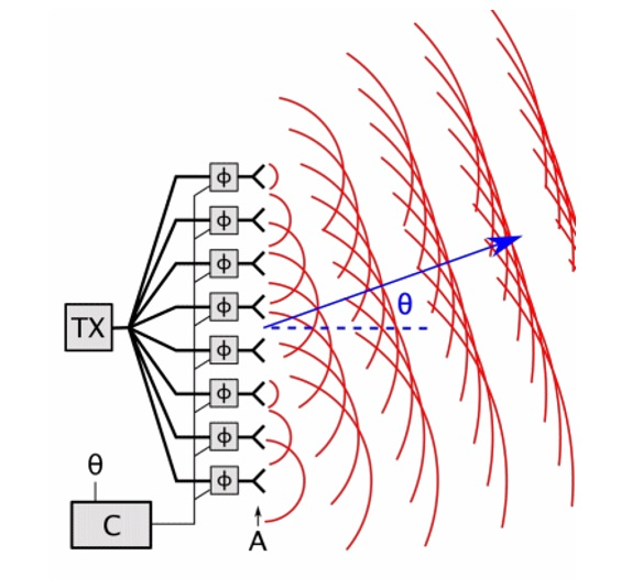原理: 通过让第 1 个天线比第 2 个天线晚 0.1 纳秒发射,电磁波在空中合成的波束就会偏转一个角度。