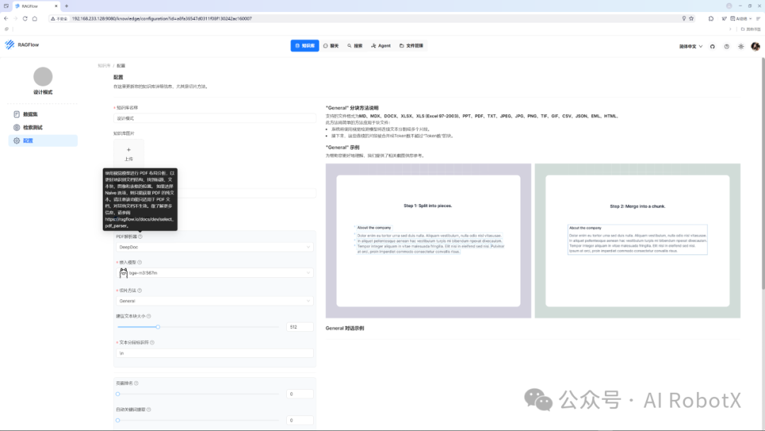 在点击“解析”按钮之前,我们需要先对准备构建的本地专属RAG知识库进行配置,这主要是为了预先设置告诉 RAGFlow:你具体将如何解析处理用户上传的文档数据,包括:PDF解析器、嵌入模型、切片方法、文本分段标识等关键点。