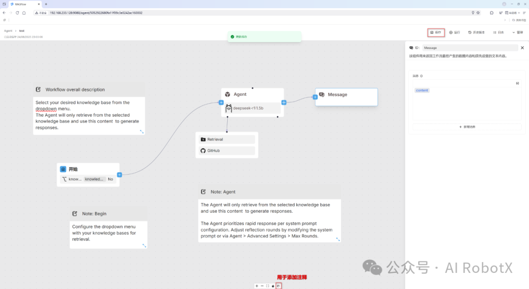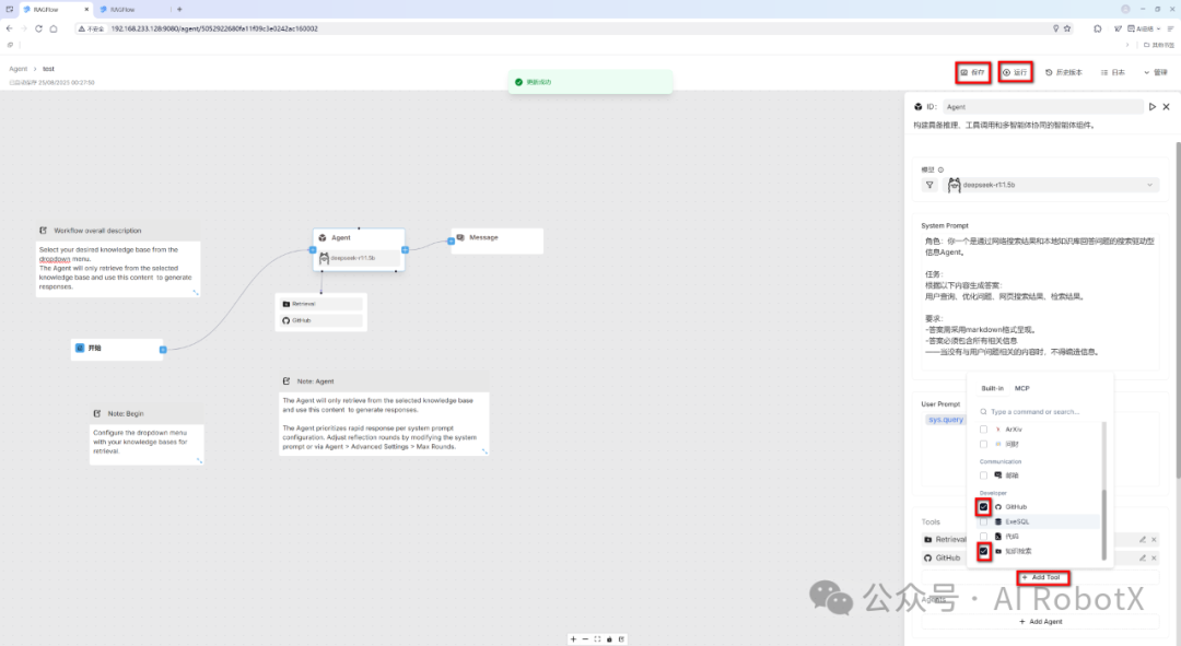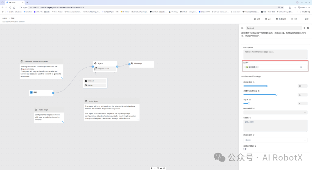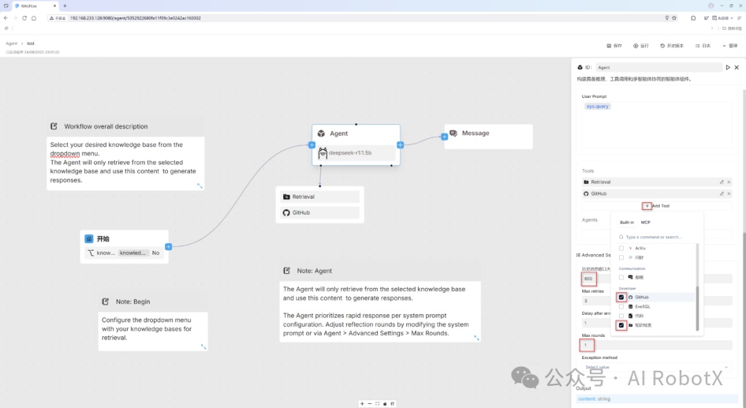 当然,RAGFlow 仍有提升空间:一是内置的工具插件与 Agent 模板数量还不够丰富;二是Agent编排界面的操作便捷性,相较于Dify工作流编排稍显逊色。当然,每个产品定位和在不同发展阶段各有侧重点,RAGFlow 当前的核心优势在于构建知识库,并深度结合大模型(如DeepSeek-R1)生成精准、上下文相关的回答。