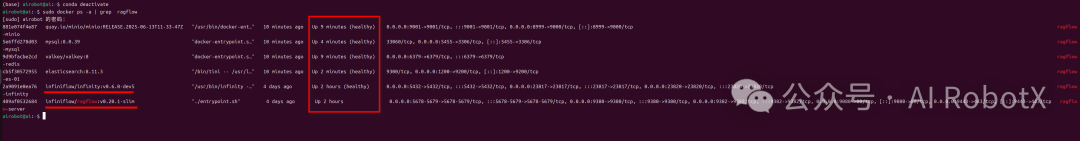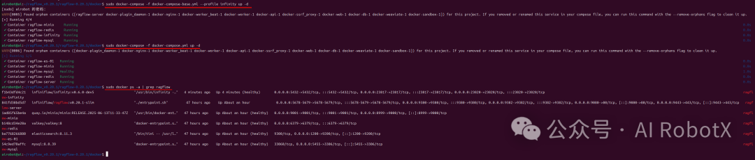 在应用RAGFlow之前,我们需要先确保RAGFlow相关容器均已正常Up启起来了,且显示health健康状态。